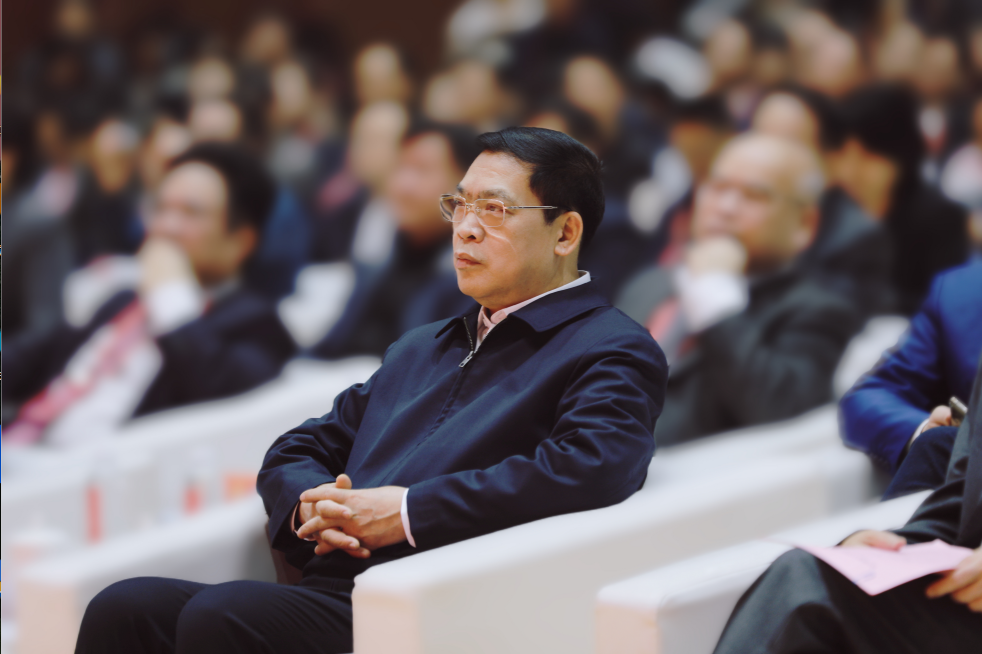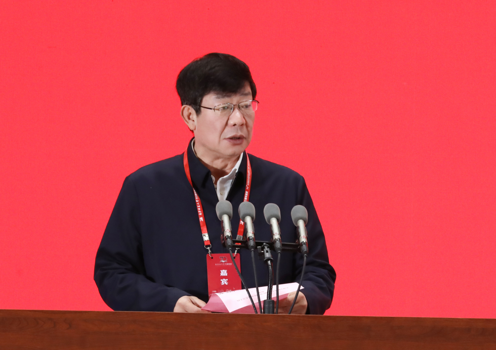 ▲自治区党委原政法委书记、自治区政协原副主席、学校校友温卡华出席大会