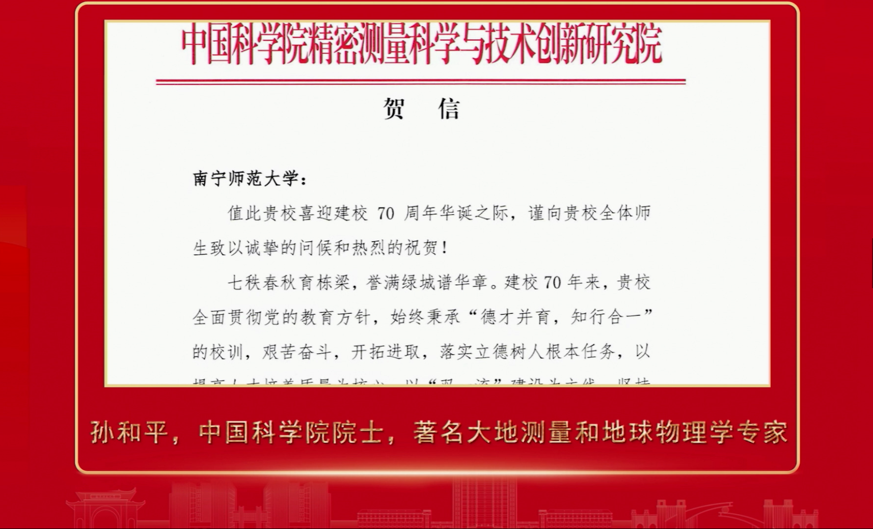 ▲中国科学院院士、著名大地测量和地球物理学专家孙和平祝福视频