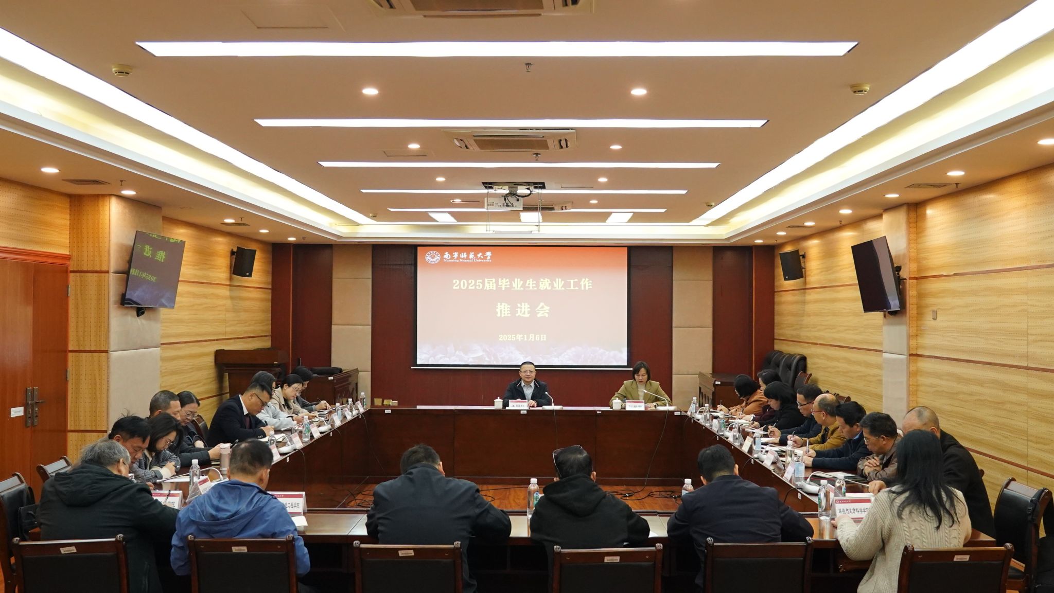 招生就业处负责人通报了近期学校2025届毕业生就业工作情况、存在问题以及下一步工作思路。文学院、数学与统计学院、地理科学与规划学院、教育科学学院、自然资源与测绘学院、美术与设计学院等六个学院作交流发言。