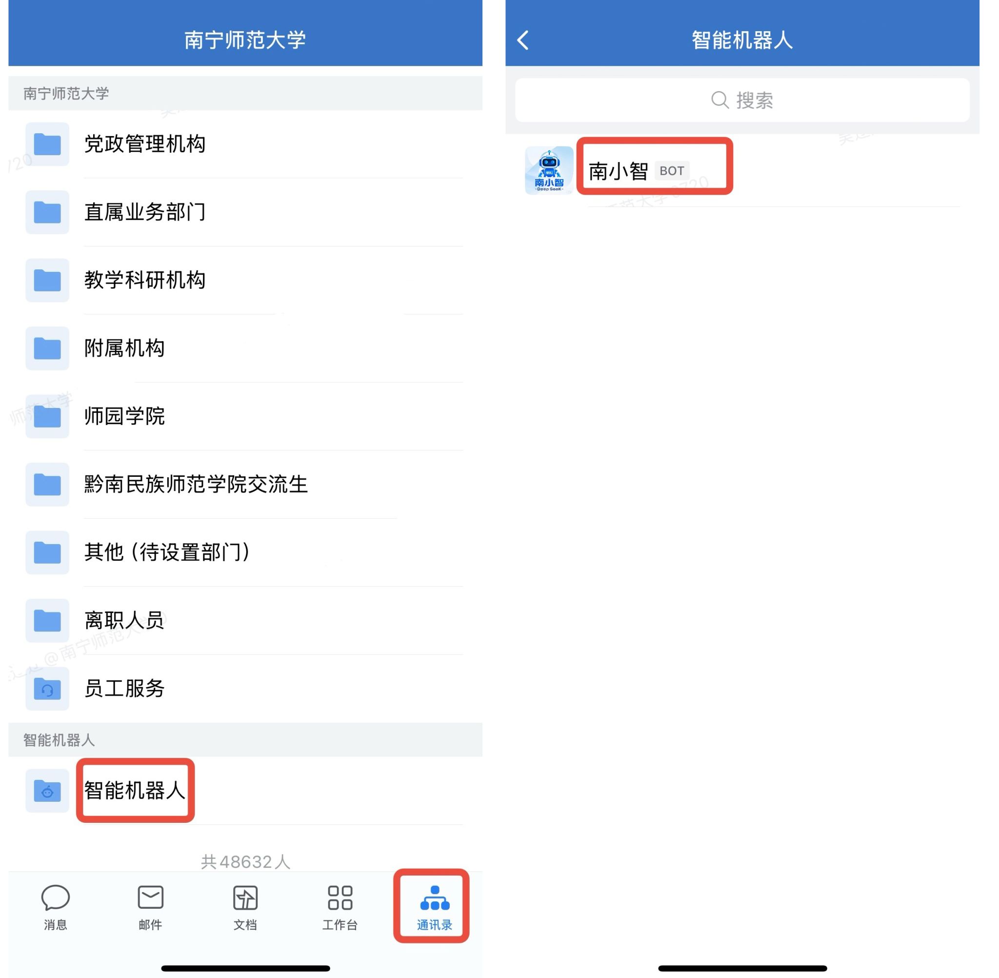 4.选择“南小智”并对话:在智能机器人列表中找到并点击“南小智”,单击“发消息”,在对话框中输入问题或咨询内容,即可获得解答。
