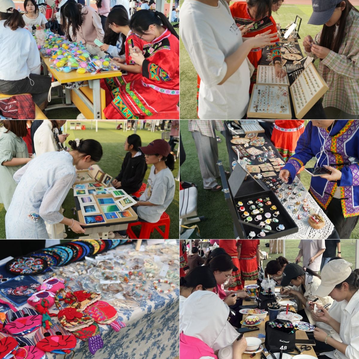 壮族文化协会的同学们组织了跳竹竿舞、打陀螺、山歌传唱、民族服饰穿戴体验以及彩蛋、漆扇、铜鼓拓印等壮潮手工DIY体验等系列活动,以歌舞和手工制作等方式让参与活动的同学们其乐融融。在青春潮创π队活动现场,各学院、社团纷纷发挥专业特长和手工特长,申请市集摊位,售卖手工艺品、鲜花等特色作品,让同学们体验了三月三校园里的“赶集”乐趣,感受民族文化与青春脑洞的碰撞。