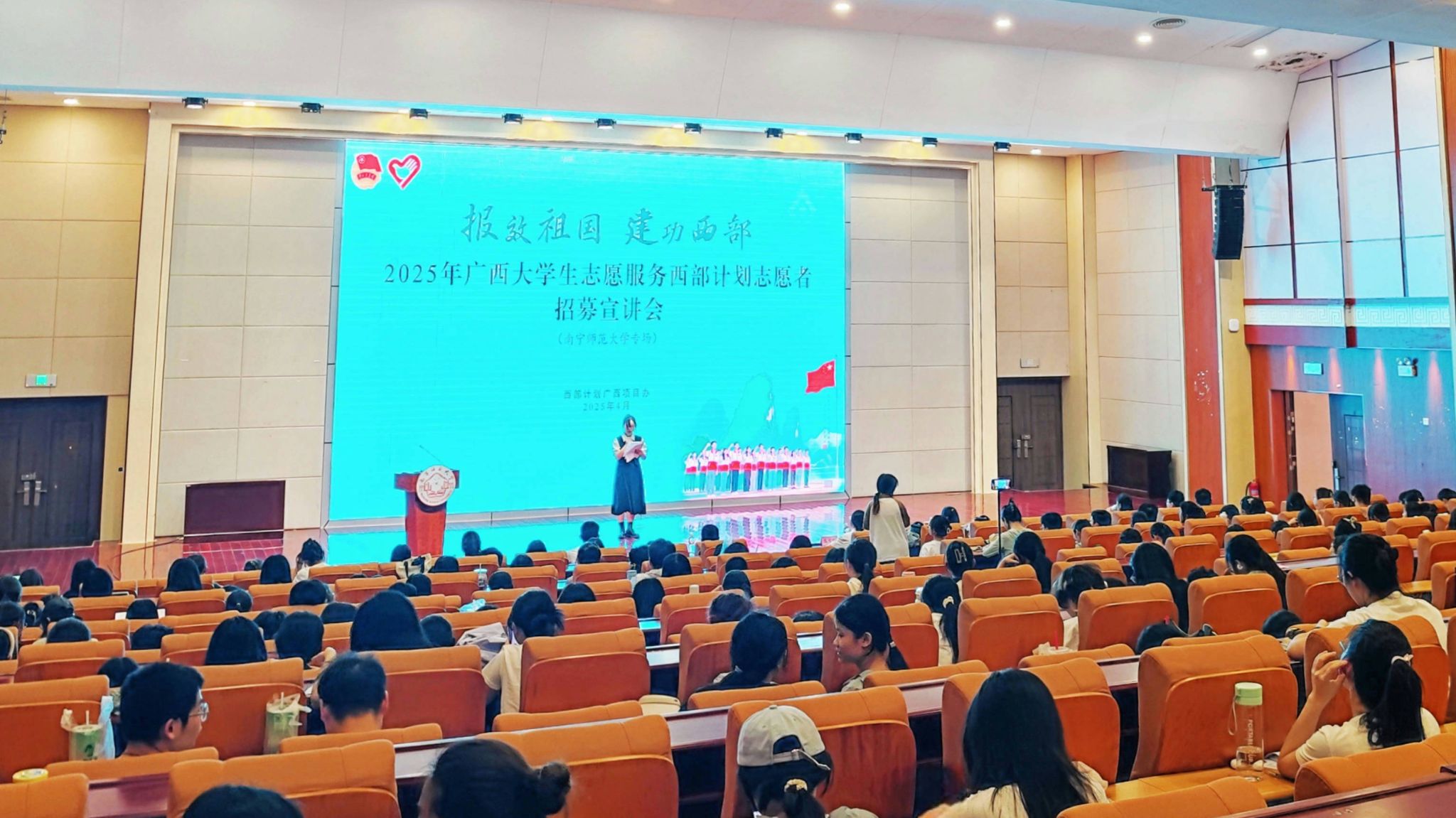 4月21日,2025年广西大学生志愿服务西部计划志愿者招募宣讲会(Beat365正版唯一官网必一专场)在Beat365五合校区文楼114学术报告厅举行,广西志愿者指导中心志愿工作事务部部长黄加荣、西部计划宣讲团成员,校团委工作人员和师生代表参加了宣讲活动。