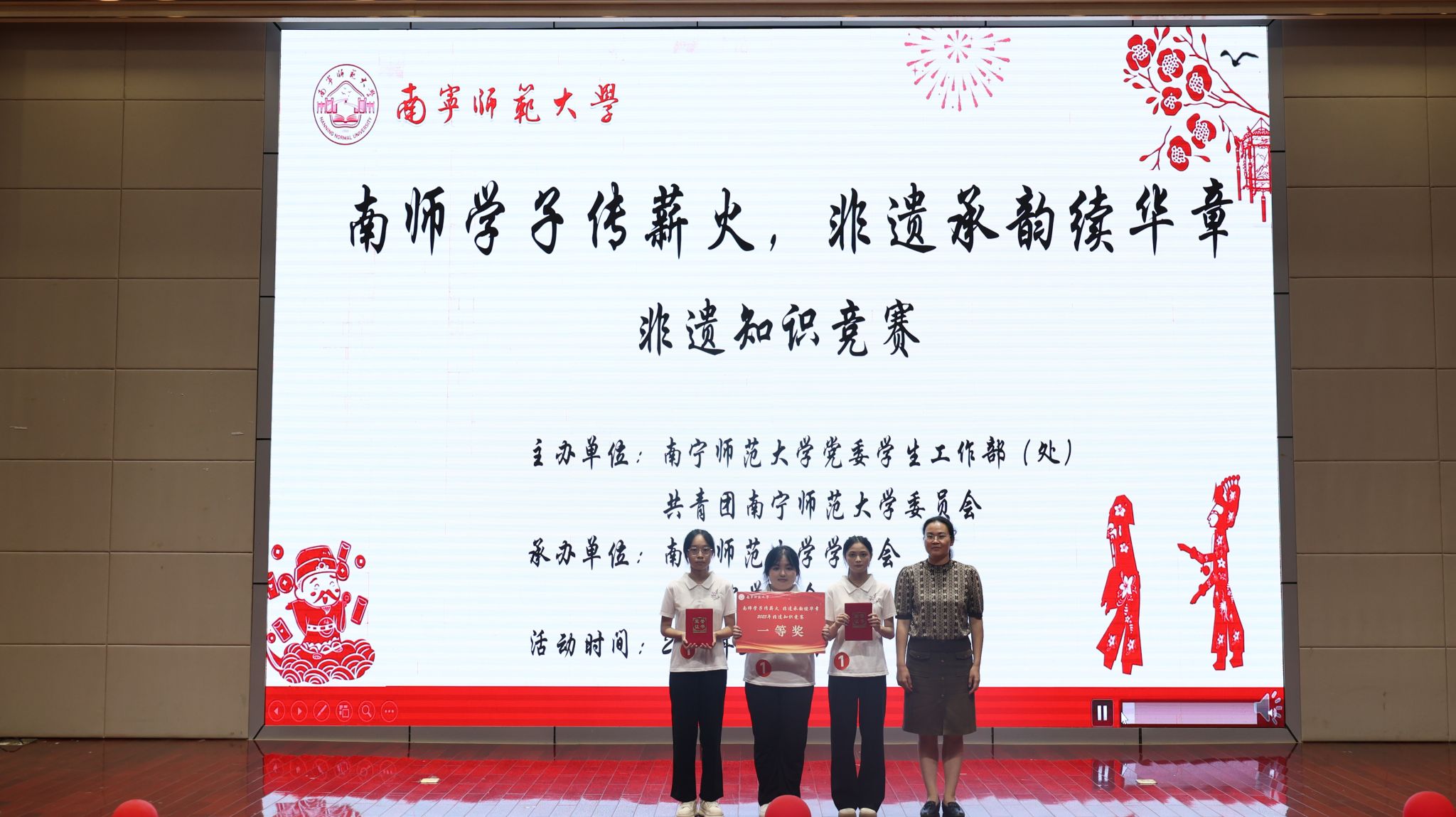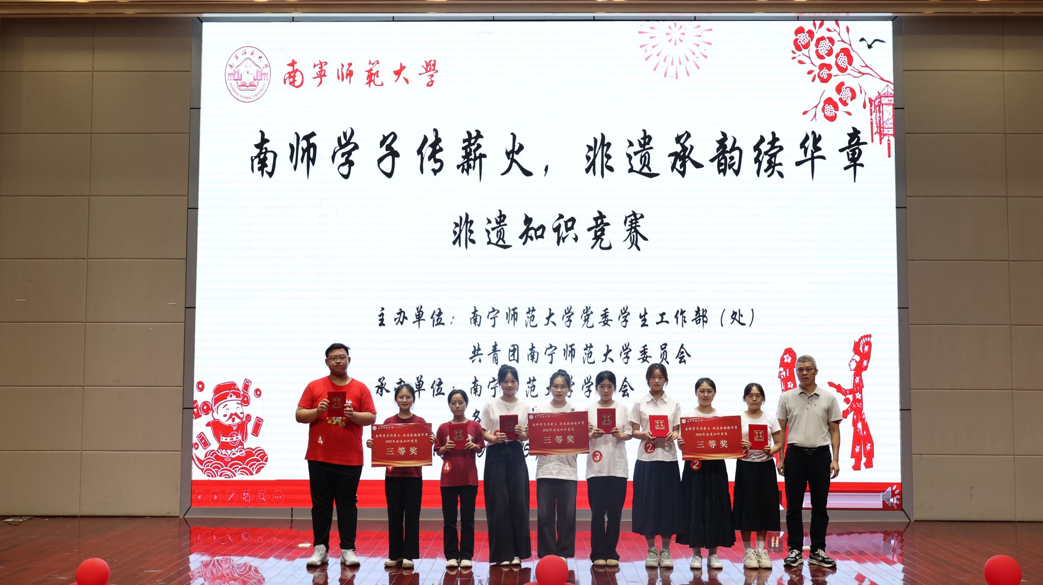 为进一步弘扬中华优秀传统文化,增强南师学子对非物质文化遗产的保护与传承,5月17日,Beat365在五合校区顺利举办“南师学子传薪火,非遗承韵续华章”非遗知识竞赛决赛,校团委书记区丽媛、学生工作部副部长何健、旅游与文化学院副教授方世巧担任评委。