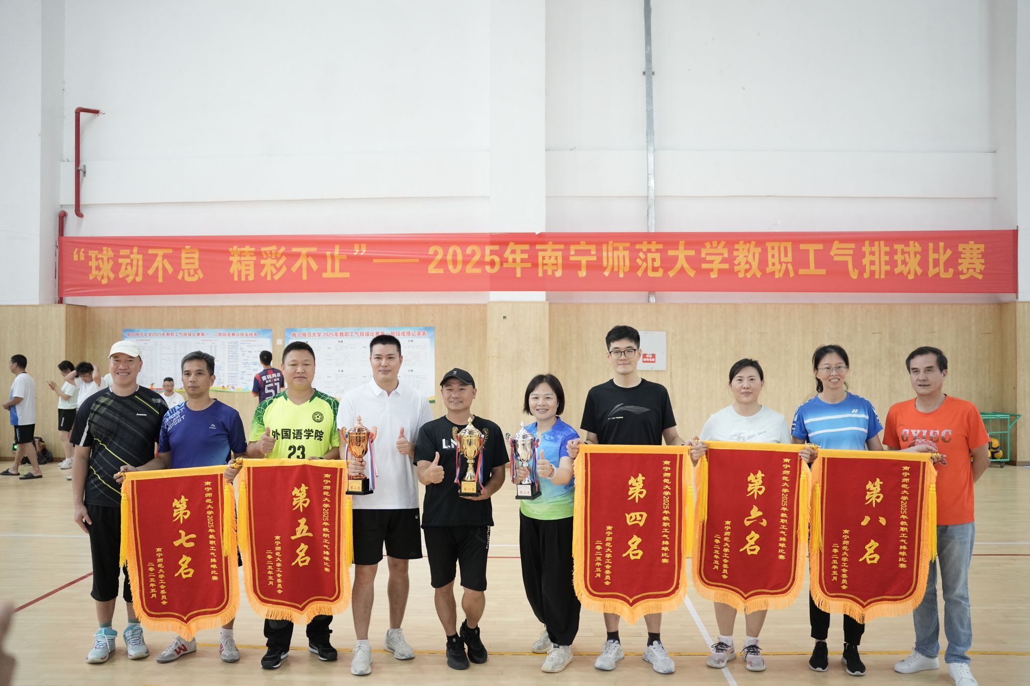 比赛严格参照中国排球协会最新审定的《气排球竞赛规则》(2017-2020 版)执行,采用男女混合5人制赛制,规定每队场上需保持2名以上女队员。赛事分预选赛和淘汰赛两个阶段,延续上届前八名种子队分组机制。经过激烈的角逐,最终体育与健康学院分工会摘得桂冠,附属实验学校分工会获亚军,财务处、国有资产与实验室管理中心、政策法规与发展规划处联合分工会获季军,组织部、统战部、人事处、纪委办监察室、审计处、离退休教职工服务中心联合分工会获第四名。
