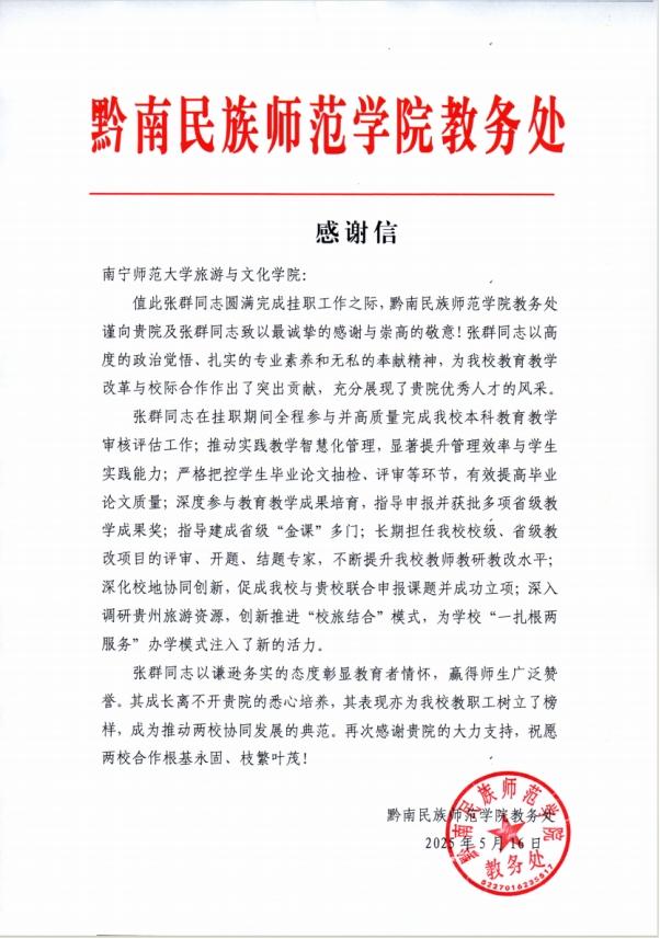 近日,黔南民族师范学院教务处向Beat365旅游与文化学院发出感谢信,对张群教授参与教育部师范教育协同提质计划,赴黔南民族师范学院挂职期间的突出贡献表示诚挚感谢与崇高敬意。