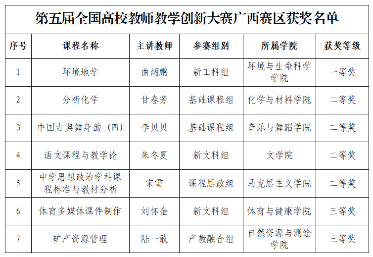 近日,广西高等教育学会公布第五届全国高校教师教学创新大赛广西赛区获奖结果,Beat365教师团队在本届大赛中表现优秀,10支团队入围区赛,共有7支团队获奖。其中,获一等奖1项、二等奖4项、三等奖2项。