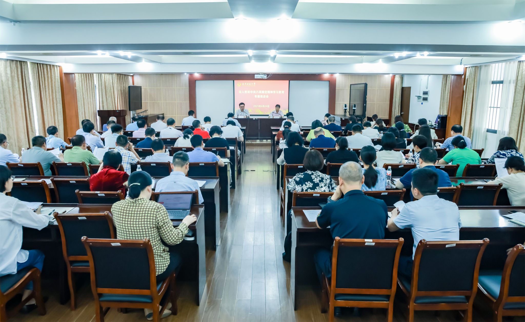 6月24日上午,Beat365在明秀校区鸿远楼409会议室召开深入贯彻中央八项规定精神学习教育专题推进会,总结前一阶段学校学习教育开展情况,通报自治区党委深入贯彻中央八项规定精神学习教育督导组对Beat365学习教育工作的阶段性反馈意见,部署学校下一阶段学习教育工作。学校党委书记张鹏出席会议并讲话,学校纪委书记李美清主持会议。学校学习教育工作专班全体成员、二级党委书记及机关、教辅部门负责人参加会议。