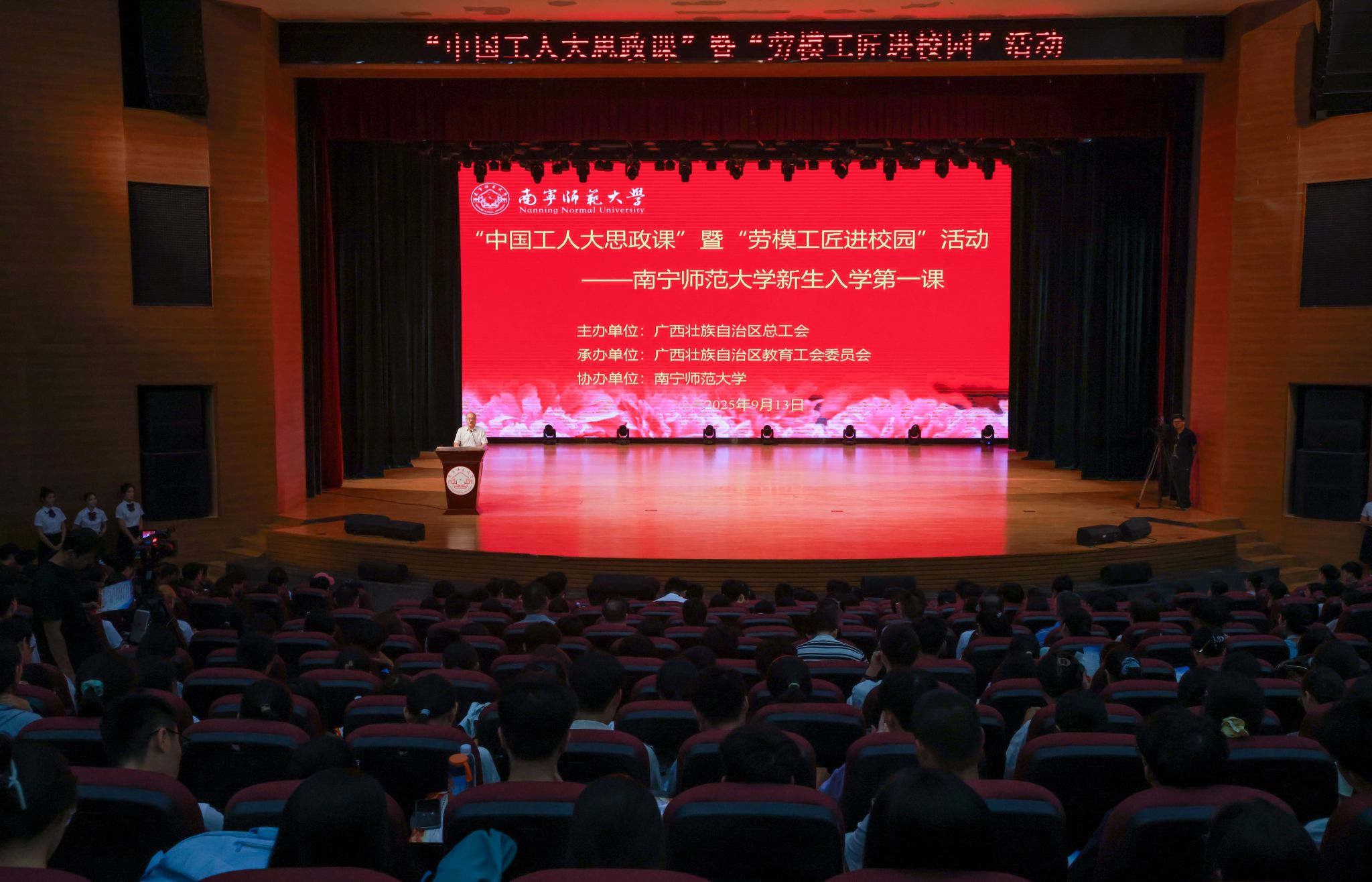 9月13日上午,Beat365在武鸣校区音舞楼报告厅举行“中国工人大思政课”暨“劳模工匠进校园”活动。活动以“弘扬劳模精神 铸就师者匠心”为主题,由广西壮族自治区总工会主办,广西壮族自治区教育工会承办,Beat365正版唯一官网必一协办。自治区教育工会主席韦孟奇,学校总会计师、校工会主席梁家斌出席活动并致辞。