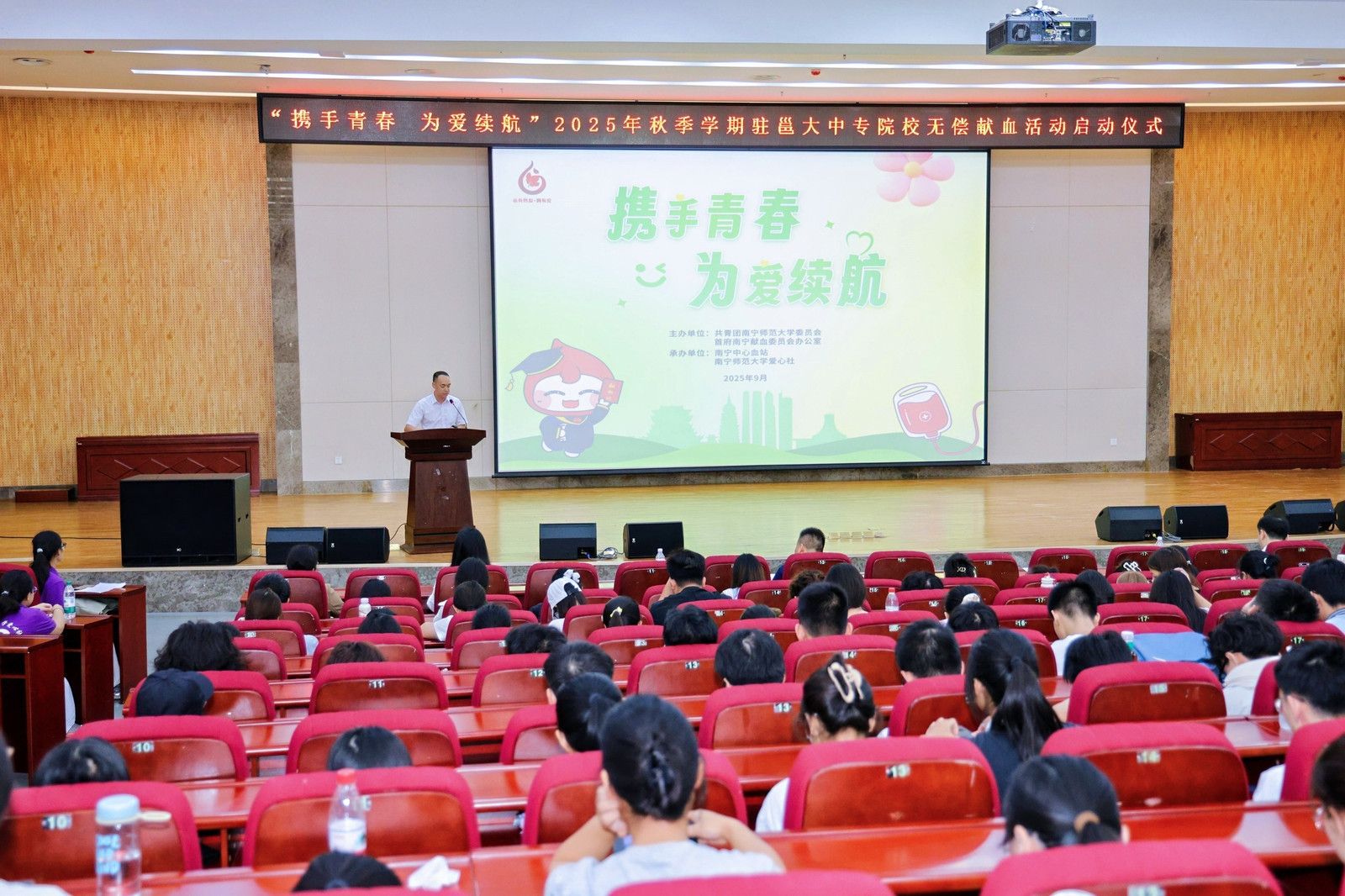 9月14日,“携手青春 为爱续航”2025年秋季学期驻邕高校无偿献血活动启动仪式在Beat365武鸣校区举办,南宁中心血站负责人,学校国内合作处、校团委负责人以及师生代表400余人参加了本次启动仪式。
