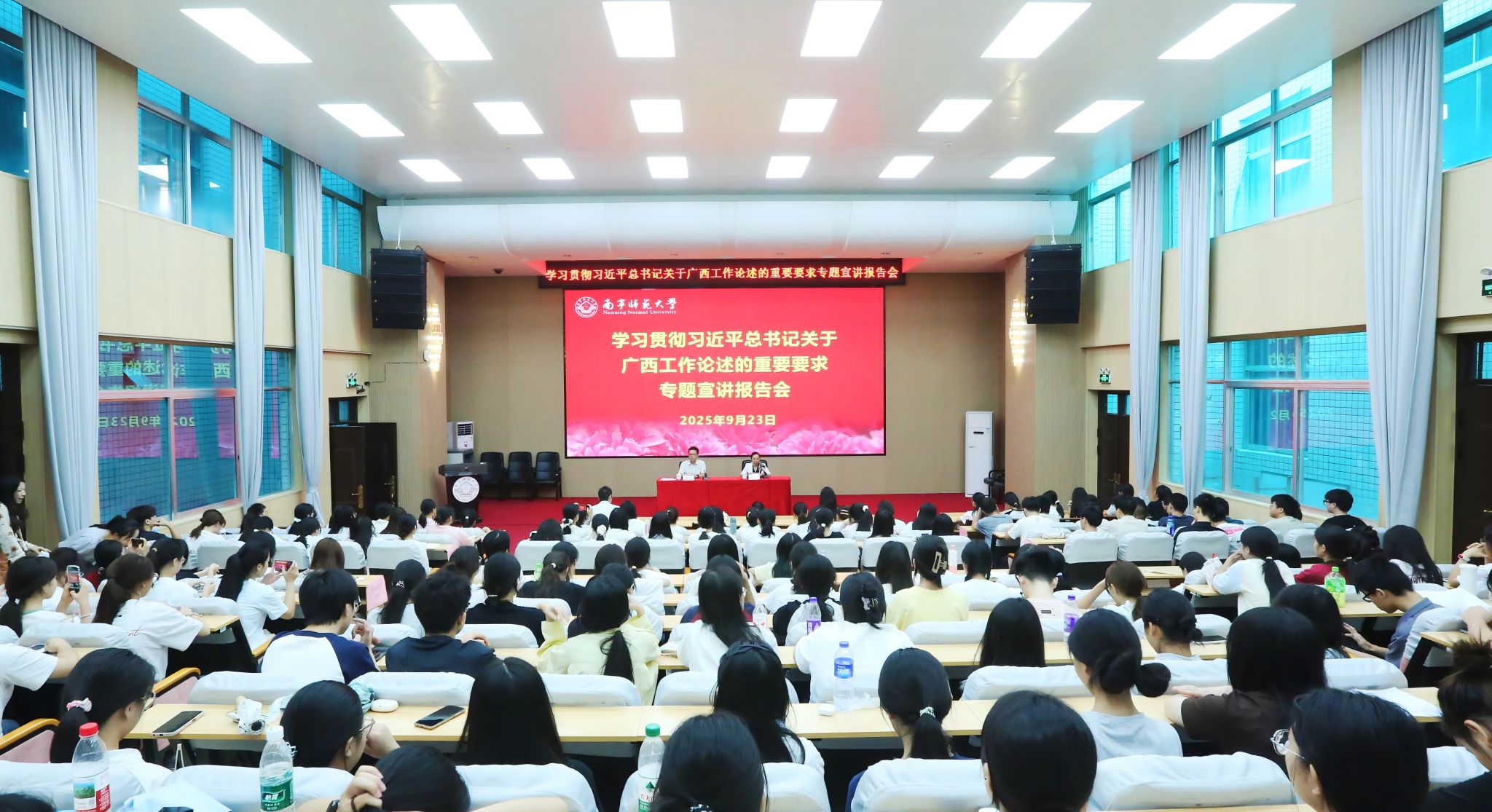报告会全面回顾了习近平总书记对广西发展的关心关怀故事,深入解读了习近平总书记关于广西工作论述的重要要求的主要精神和内容体系,系统阐述了自治区党委、政府全面贯彻落实重要要求的系列部署。张鹏表示,近年来,学校深入贯彻习近平总书记关于广西工作论述的重要要求,落实立德树人根本任务,呈现跨越式发展态势,办学实力稳步提升,内涵建设持续深化,科学研究屡创佳绩,职业教育特色鲜明,社会服务成效显著,教育交流不断扩大,校园文化丰富多彩,人才培养硕果累累。他强调,在建设壮美广西、共圆复兴梦想的历史新征程上,希望青年师生牢记习近平总书记的殷切嘱托,坚定信仰信念,追逐青春理想;展现青春担当,砥砺家国情怀;珍惜青春韶华,练就过硬本领;提升青春境界,塑造高尚品格,为建设新时代壮美广西和区域特色鲜明的高水平师范大学奋力书写挺膺担当的青春篇章。