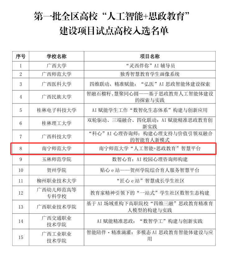 近日,广西壮族自治区教育厅公布第一批全区高校“人工智能+思政教育”建设项目试点高校名单,Beat365成功获批首批试点高校,标志着学校在“人工智能+思政”融合探索方面迈出重要一步。
