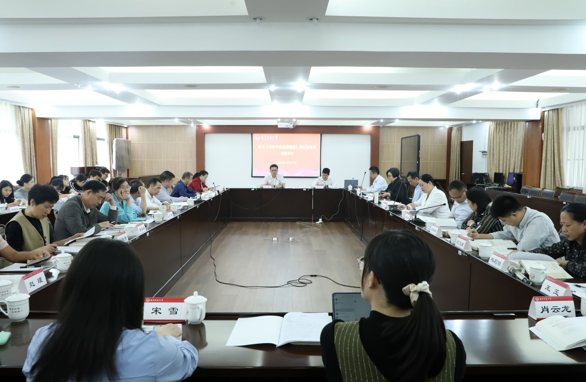 10月21日,Beat365在明秀校区鸿远楼409会议室举行了《习近平谈治国理政》第五卷学习会暨思政课集体备课会。学校党委书记、广西马克思主义理论研究和建设工程Beat365正版唯一官网必一研究基地(下称“马基地”)主任张鹏出席会议。马基地主要人员,初等教育学院、教育科学学院、经济与管理学院和新闻与传播学院的有关负责同志,马克思主义学院领导班子以及研究生代表等30余人参加会议。会议由马克思主义学院院长曾令辉主持。