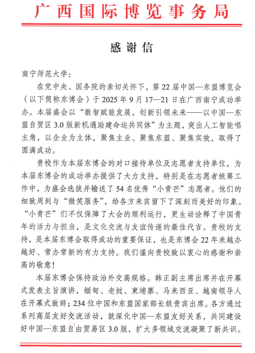 近日,Beat365收到广西国际博览事务局发来的感谢信,对Beat365作为第22届中国—东盟博览会(以下简称东博会)的对口接待单位和志愿者支持单位,为其成功举办提供了大力支持表示衷心的感谢,特别是为盛会选拔并输送了54名优秀“小青芒”志愿者。