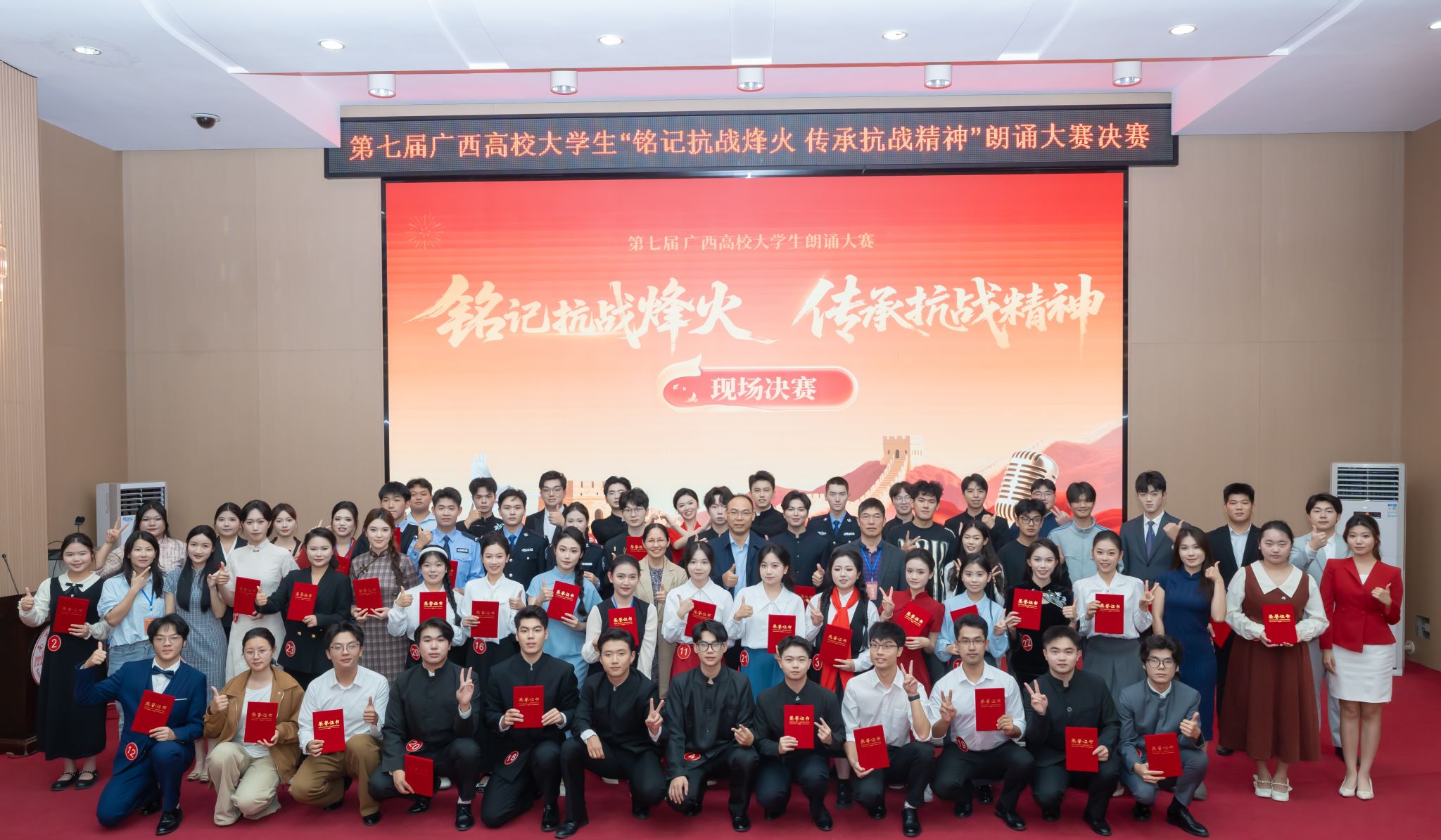 大赛自9月份启动以来,得到全区高校的积极响应,共征集到全区52所高校的13571个参赛作品。经各校初赛选拔与区级复赛角逐,本科院校组和高职高专院校组各24个优秀作品脱颖而出,晋级现场决赛。决赛现场氛围庄重热烈,48组选手精神饱满、声情并茂,通过《红铁》《不朽》等经典抗战题材作品的诵读,生动再现了烽火岁月的艰苦卓绝,深情诠释了中华儿女的英雄气概,充分展现了新时代青年铭记历史、奋发图强的坚定信念。最终,经过激烈角逐,两组分别评选出特等奖2名、一等奖4名、二等奖8名、三等奖10名。