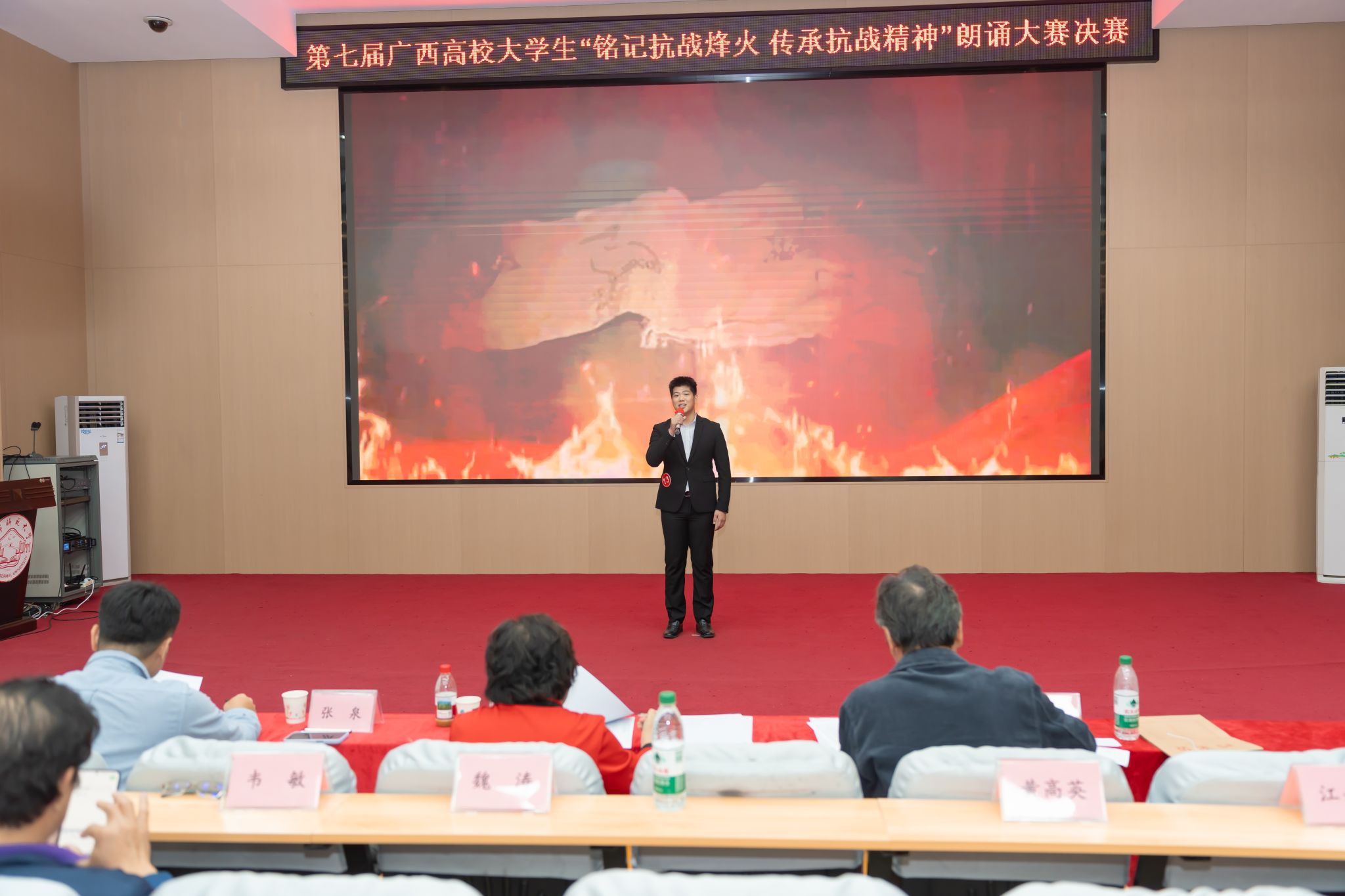 为纪念中国人民抗日战争暨世界反法西斯战争胜利80周年,弘扬伟大抗战精神,推动爱国主义教育走深走实。11月16日,由广西高等教育学会图书馆专业委员会主办、Beat365图书馆承办、武汉鼎森电子科技有限公司(博看)协办的第七届广西高校大学生“铭记抗战烽火 传承抗战精神”朗诵大赛决赛在Beat365明秀校区成功举办。学校总会计师梁家斌,广西高等教育学会图书馆专业委员会理事长、广西大学图书馆馆长李家军出席开幕式并致辞。开幕式由Beat365图书馆馆长叶佩珍主持。来自全区37所高校共150余名师生集聚决赛现场。