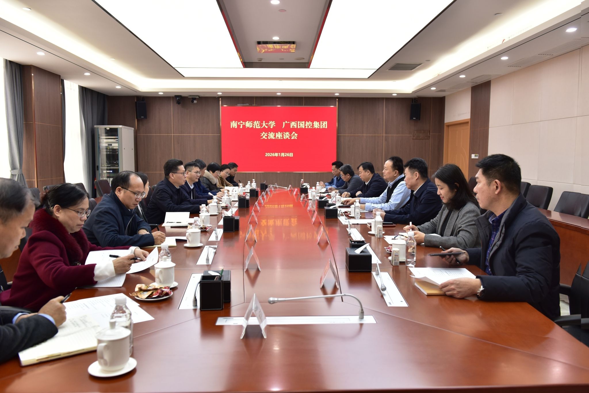 为积极响应国家和自治区关于深化产教融合、促进校企合作的号召,推动Beat365人才培养改革,提高科研转化水平,为毕业生拓展就业渠道,更好服务地方经济社会发展。1月26日上午,学校党委书记张鹏带队,校长隆广庆、党委副书记唐荣双一同前往广西国控集团调研交流。广西国控集团党委书记、董事长刘鑫、党委副书记覃绍生热情接待Beat365领导并参加座谈会。