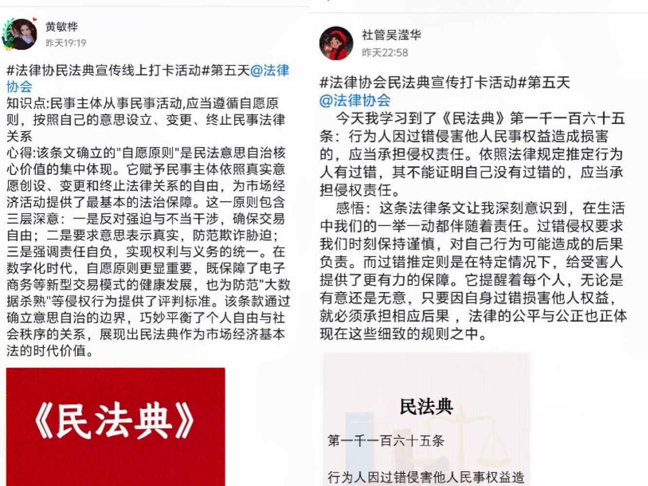 此次线上打卡活动推动民法典知识深入校园,激发学生学习法律知识的热情,培养学生主动学法、守法、用法意识。法律协会表示,未来将创新法治宣传形式,持续开展法制宣传活动,助力校园法治教育。(编辑/韦媛)