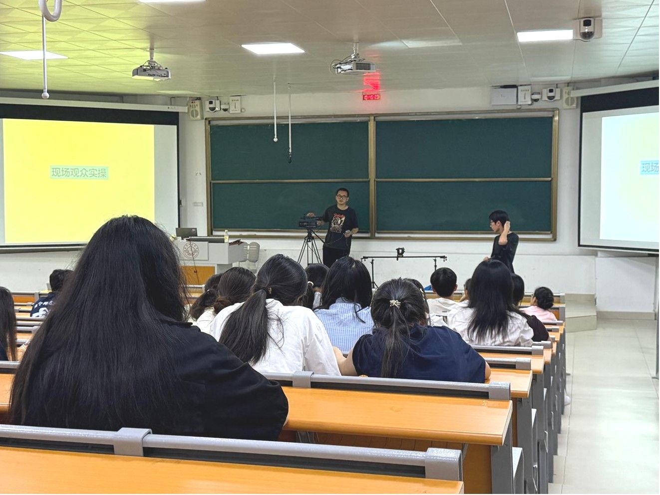 本次活动旨在通过系统化教学与趣味实践,帮助零基础学生快速入门,培训内容分为理论讲解与实践操作两大板块。在理论讲解环节,影像部工作人员通过PPT现场演示,从分镜头拍摄和脚本撰写等基础理论到高阶技巧层层递进讲解,同时详细拆解相关核心技巧、介绍剪辑软件操作并解答拍摄中的常见问题。在实践环节,参与者分组进行直播设备安装调试、多机位协同操作及影像设备实践应用体验,让学生在实践中更好理解与运用,掌握新媒体创作技能。
