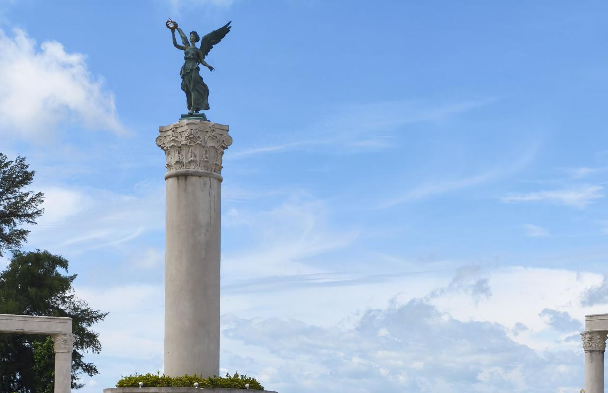 一座洁白的女神雕塑展翼立于碧空之下,汉白玉材质在阳光下流转着圣洁的光晕。她羽翼高扬似要凌空而起,裙裾被海风塑出永恒的飘动感,手中的橄榄枝指向无垠的海洋,在蓝天白云间构筑出令人敬畏的圣洁氛围。