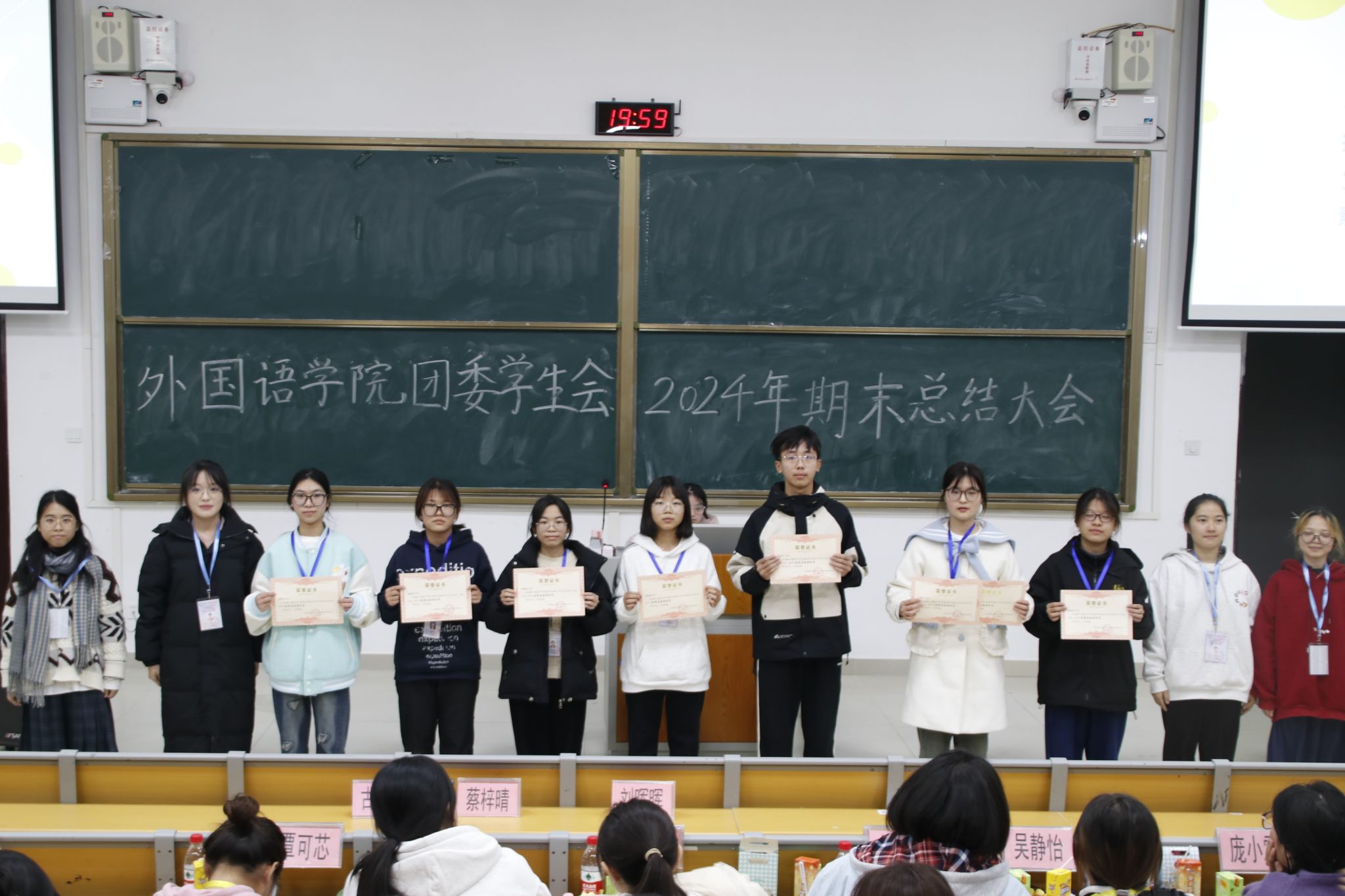 最后,各部门工作人员为本学期优秀志愿者及后备团成员颁奖。随着颁奖环节的顺利结束,外国语学院团委学生会2024-2025学年第一学期期末总结大会正式落下帷幕。