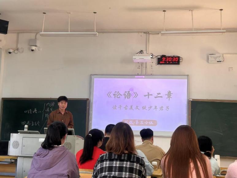 韦教授简要介绍了本学期课程的学习计划,并开启了第一章第一节内容——《论语》十二章的学习。第二节课则继续深入探讨该主题,学生们通过小组汇报的形式进行了学习交流,韦教授对每个小组的表现进行了精准点评和专业指导。整个过程中,韦教授的教学方法深入浅出,课堂安排合理,极大地激发了学生的学习热情。