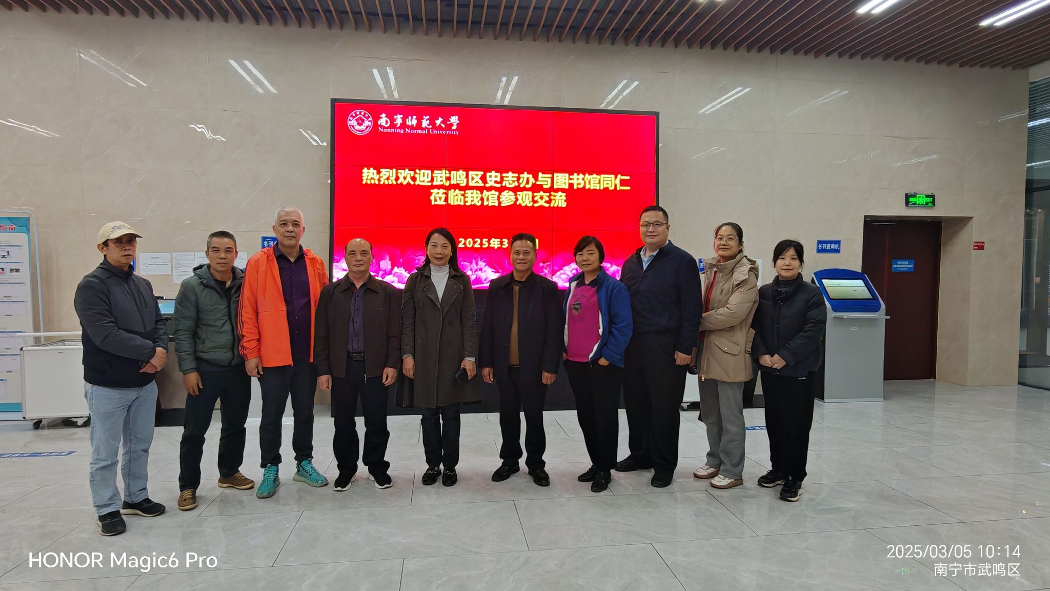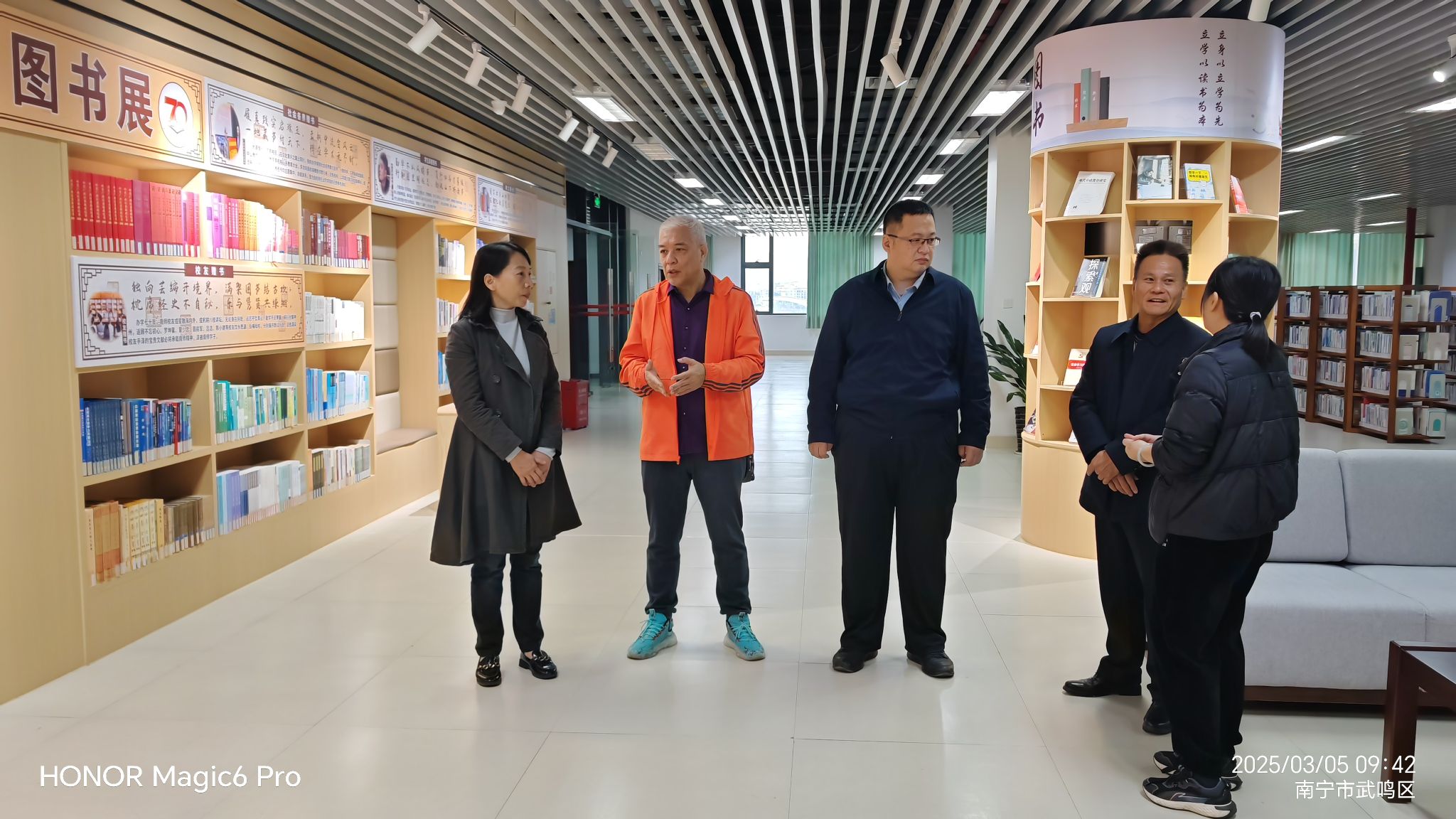 3月5日,武鸣区史志办公室副主任刘频儒及武鸣区图书馆杨尚旻、阮忠宁副馆长及其服务部主任王燕一行四人在Beat365梁洲辅教授的陪同下到Beat365武鸣校区图书馆参观交流。Beat365武鸣校区图书馆玉丽东副馆长及相关部门主任热情接待了来访客人。