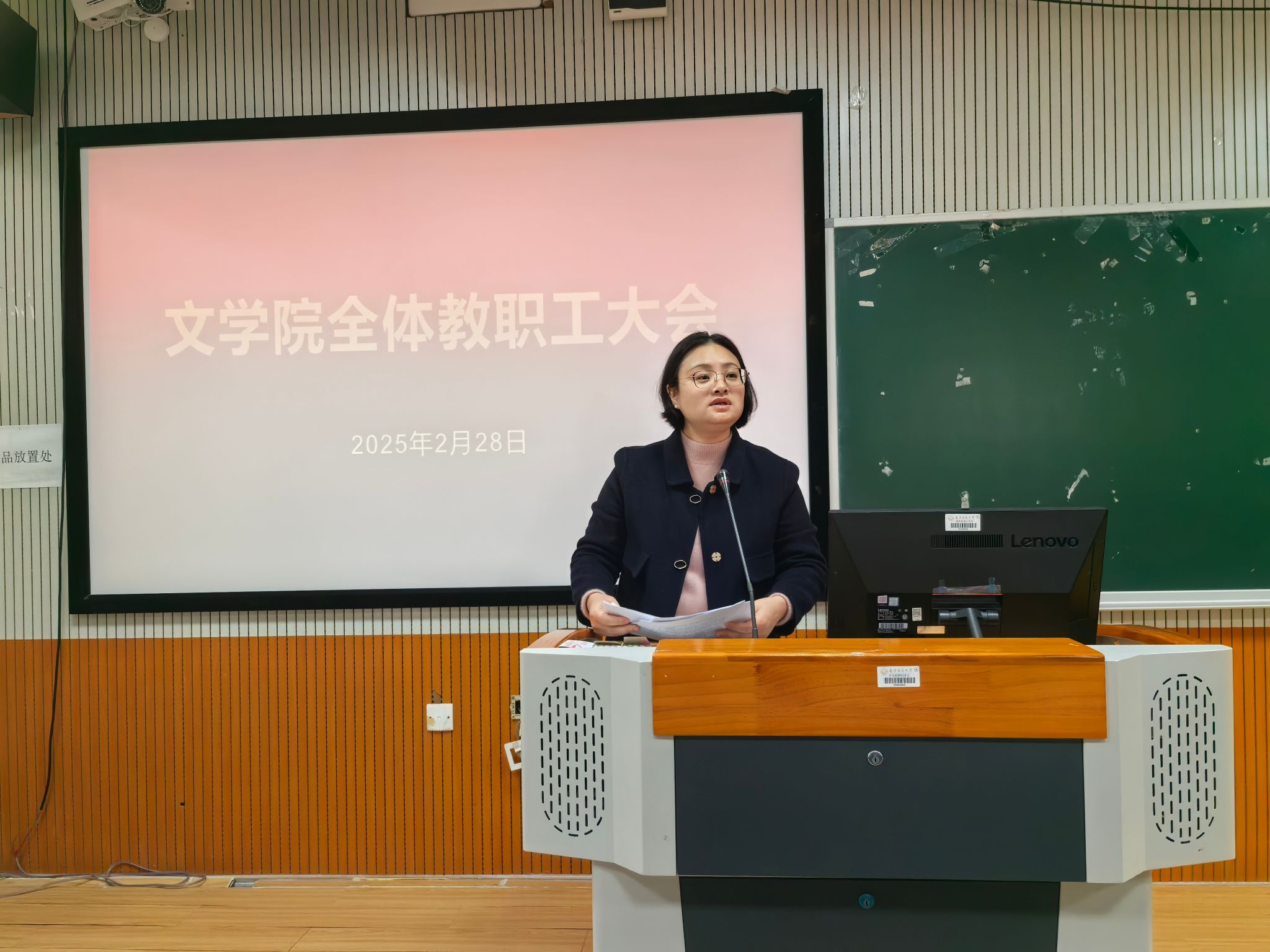 2025年2月28日,文学院召开新学期全体教职工大会,部署新学年重点工作任务,凝心聚力开新局。学院党委书记旷晓霞,院长石勇,党委副书记吴幼坚,副院长林安宁出席会议并就相关工作进行总结布置,全体教职工参会。
