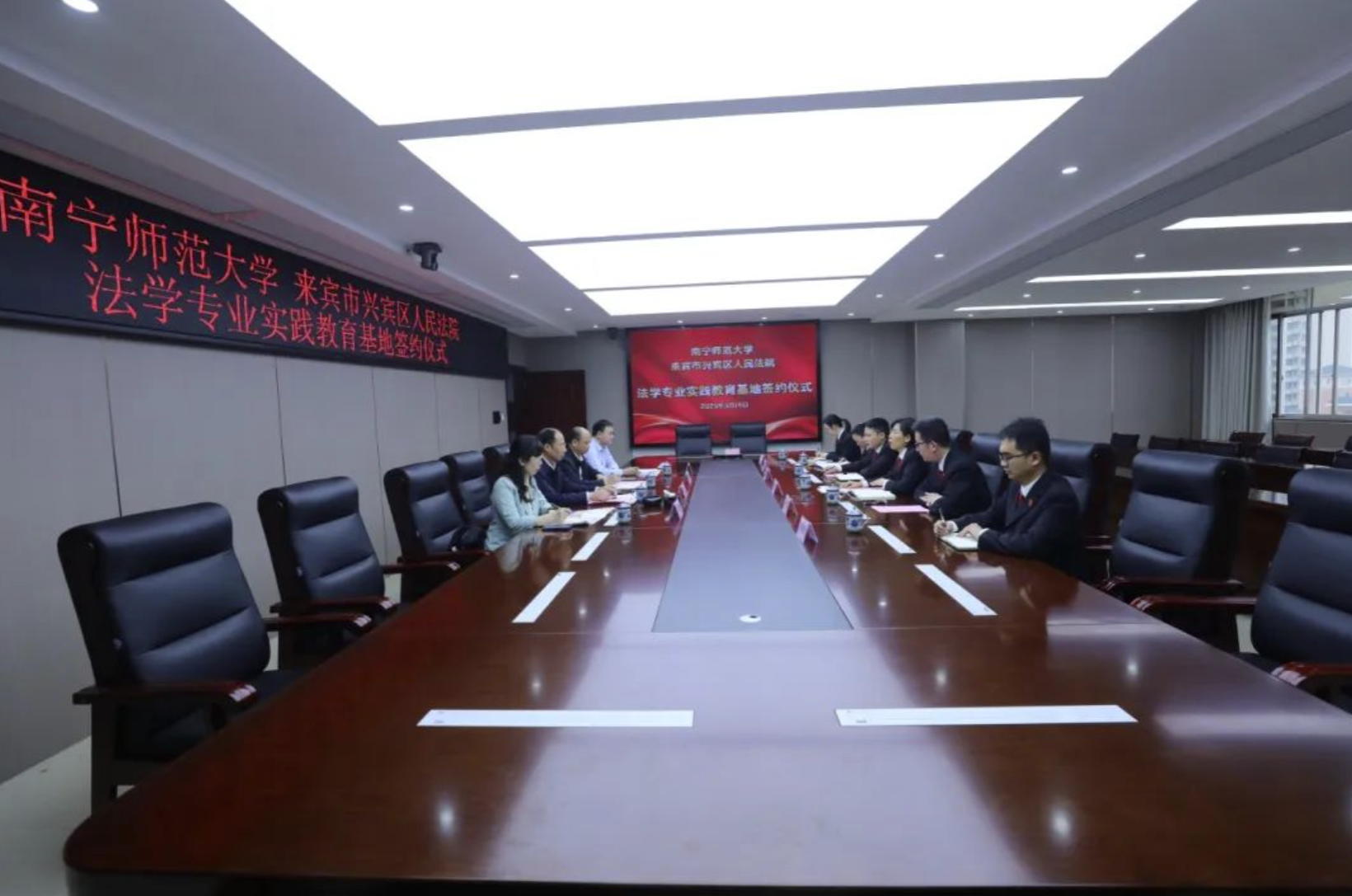 为深化院校合作,推动法学专业实践教学与就业工作深度融合,3月14日下午,法学与社会学院一行前往来宾市兴宾区人民法院开展访企拓岗活动并举行法学专业实习实训基地授牌仪式。法学与社会学院院长尹文嘉教授、副院长卢明威研究员、法律系龚战梅教授和中国-东盟数字法学研究院副院长兰敬博士共同出席。兴宾区法院党组书记、院长廖干豪,副院长覃仪晏,副院长曾德文,以及审管办、综合办、政治部相关负责同志参加座谈。