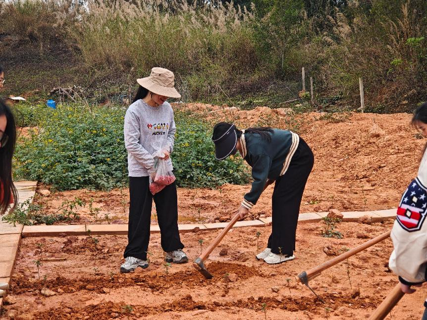 活动开始前,支部副书记黄小倩针对本次播种花生活动进行安排,给同学们分发镰刀、小锄头等工具。随后,同学们有序地开展翻土、挖坑、撒肥料、填土等工作,现场劳动热情高涨。