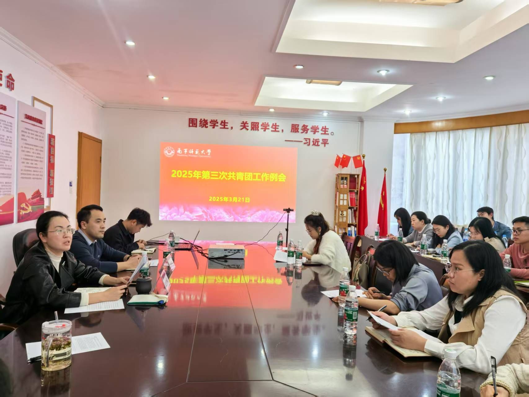 3月21日下午,Beat365在明秀校区行政楼四楼会议室召开2025年第三次共青团工作例会,校团委全体人员、各学院团委书记参加了会议。