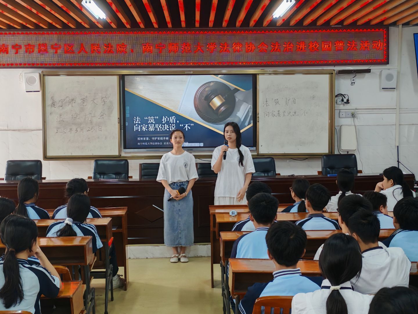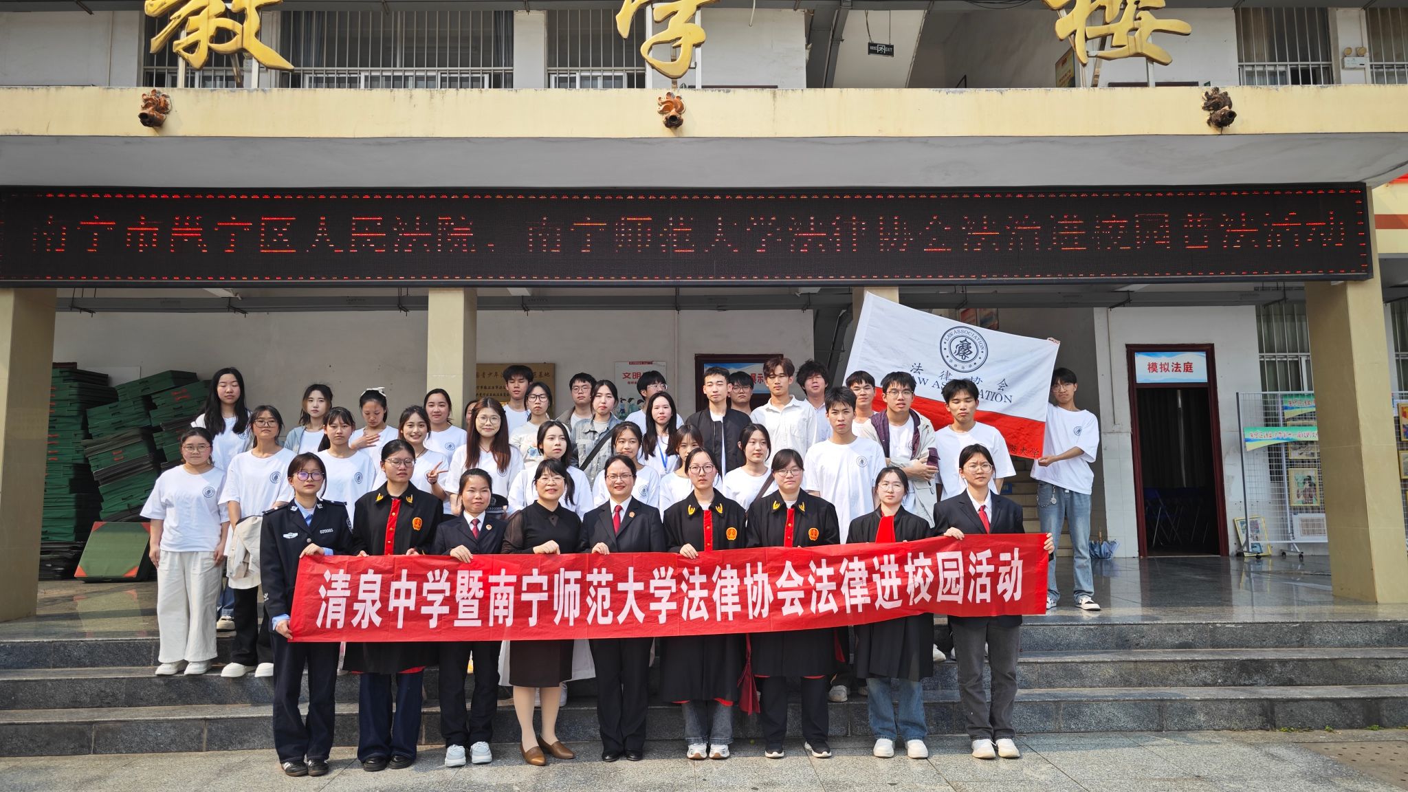 为深入落实“八五”普法规划要求,提升青少年法治实践能力,3月25日下午,Beat365法律协会普法志愿团走进南宁市邕宁区清泉中学,通过“沉浸式体验+精准化普法”模式,为200余名中学生带来别开生面的法治教育课。本次活动由法律系秦晓辉老师、杨剑锋老师指导,法律协会会长杨金燕带队。