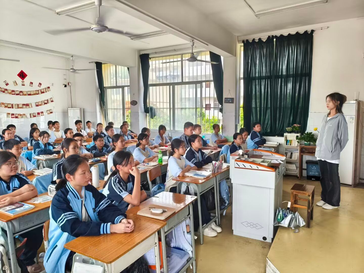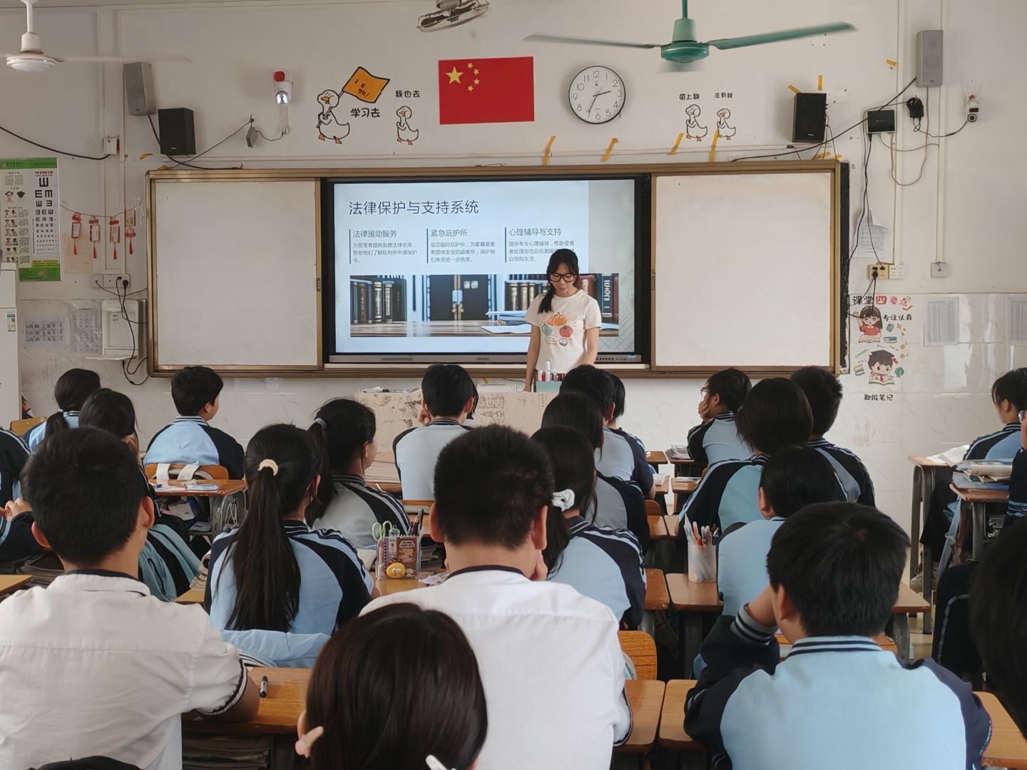针对“网络直播打赏””校园暴力应对”等热点问题,志愿者通过“情景模拟+以案释法”进行解答,结合《未成年人保护法》修订亮点开展互动教学。初二(3)班学生在“法律急诊室”环节提问:“遇到高年级同学索要‘保护费’该怎么办?”志愿者结合《刑法》关于敲诈勒索的司法解释,现场演示保留证据、寻求帮助的规范流程。