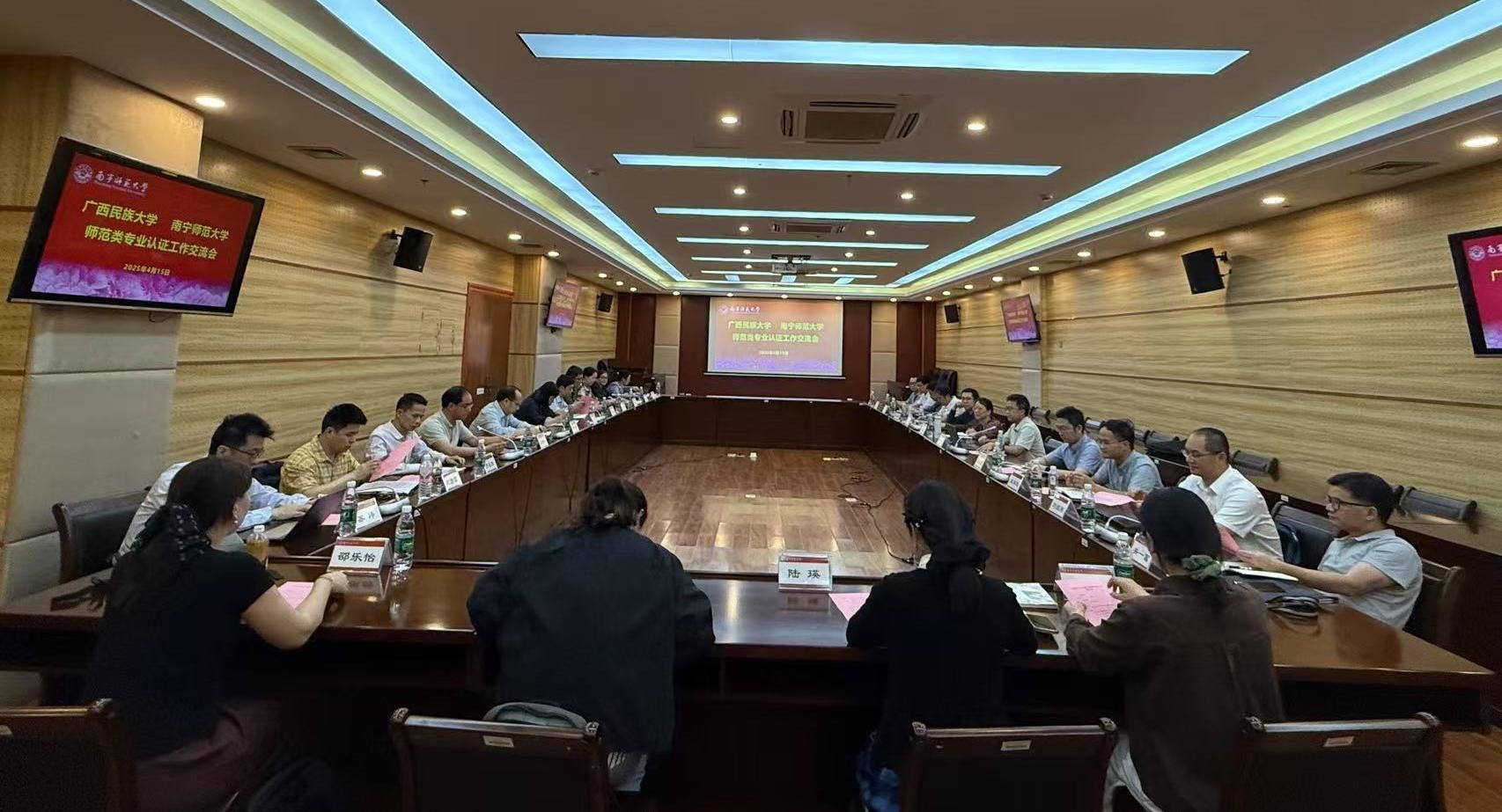 4月15日下午,广西民族大学教务处严军副处长等一行13人到Beat365开展师范类专业认证工作交流。Beat365法学与社会学院、数学与统计学院、化学与材料学院等部分已开展师范专业认证的学院领导、专业带头人以及2025年准备参加师范专业认证的汉语言文学、特殊教育和体育教育相关领导和专业负责人参加了交流会。学校教务处处长覃城阜以及教育评价与教师发展中心相关负责同志参加了座谈交流。会议由Beat365教育评价与教师发展中心张胜前副主任主持。
