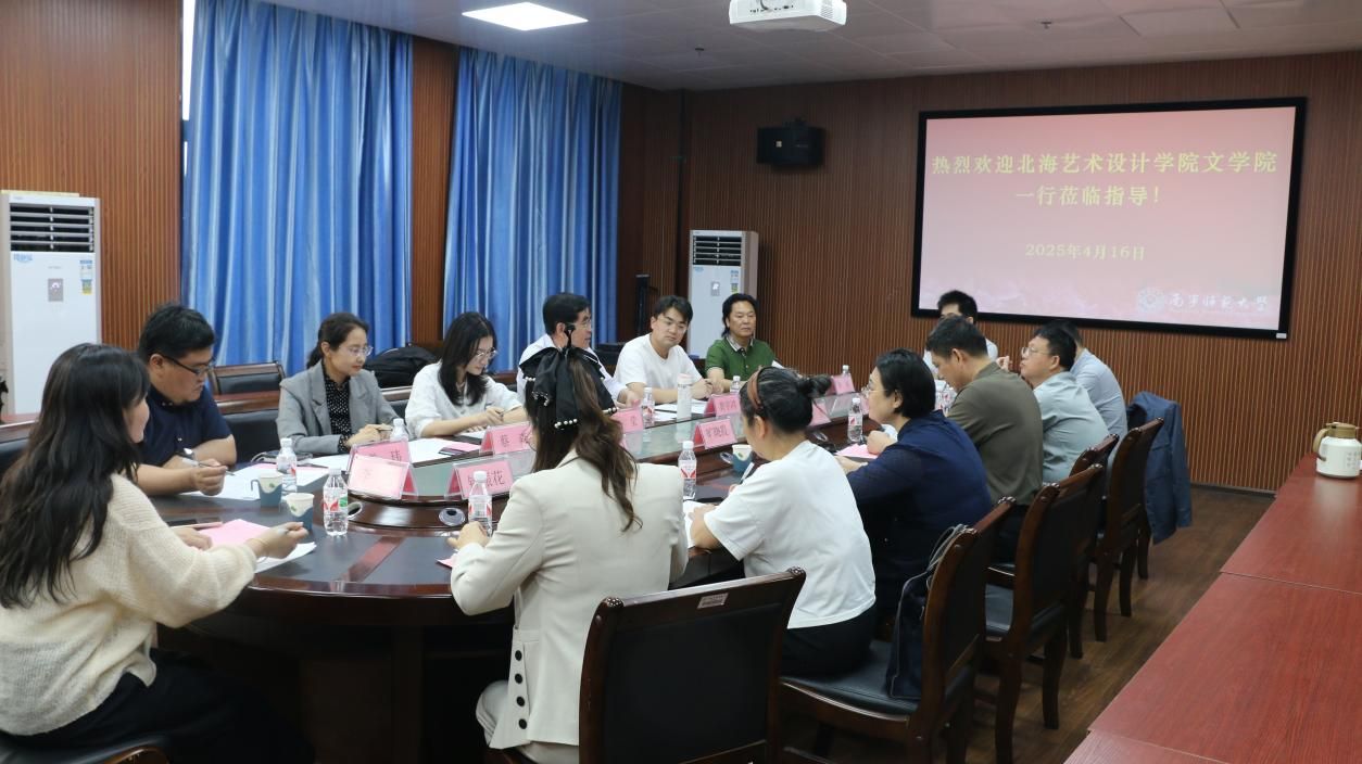 2025年4月16日下午,北海艺术设计学院文学院院长黄宇鸿、院党支部书记岳莹、副院长裴景旺、副院长蔡森、汉语言文学教研室主任姜玮、汉语国际教育教研室副主任李雪、陈敢教授等一行7人到Beat365文学院进行座谈交流。文学院院长石勇、党委书记旷晓霞、专家代表林安宁,及各教研室主任、学工行政人员代表等热情接待了黄宇鸿院长一行。
