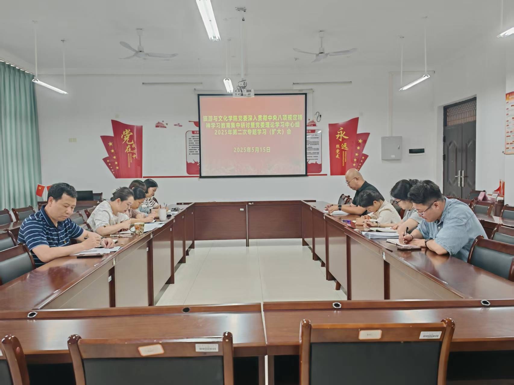 5月15日下午,旅游与文化学院党委深入贯彻中央八项规定精神学习教育集中研讨暨学院党委理论学习中心组2025年第二次专题学习(扩大)会在武鸣校区地信楼B201会议室举行。会议由学院党委书记贾坷主持,学院党委理论学习中心组成员参会,各党支部书记列席会议。