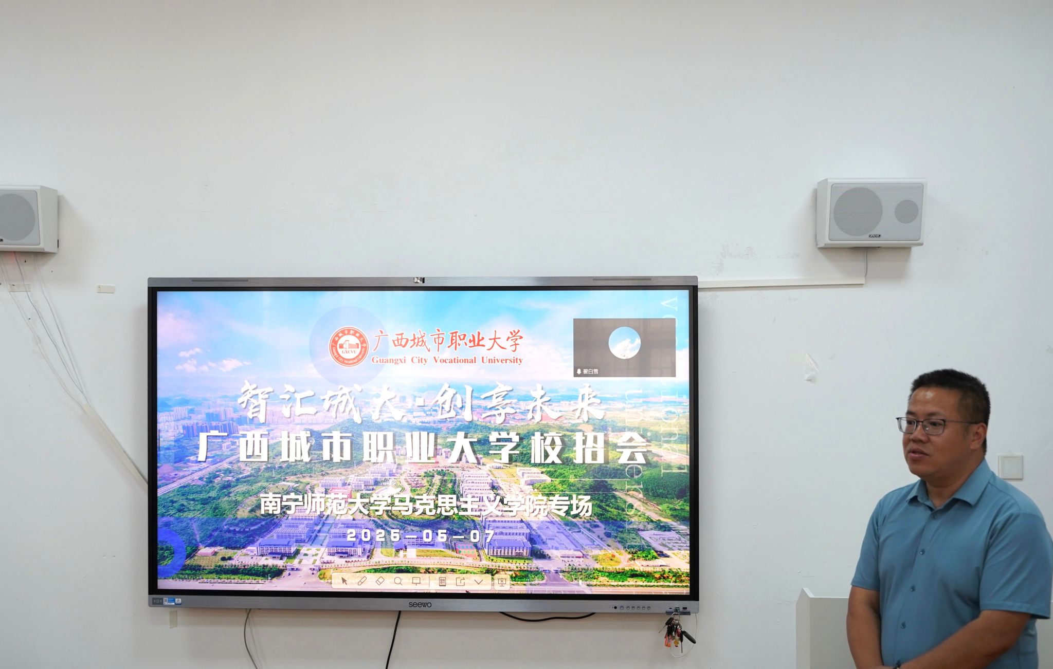 在宣讲会上,广西城市职业大学马克思主义学院院长蒙振海通过播放学校宣传片向毕业生全方位展示了学校的整体风貌,介绍了学校的办学理念、发展历程以及独具特色的校园文化,阐述了学校在学生综合素质培养与专业能力提升方面的目标与期望,着重强调学校对思政课教师队伍建设的高度重视,向在场毕业生发出诚挚邀请,希望大家能够加入广西城市职业大学,共同投身教育事业。