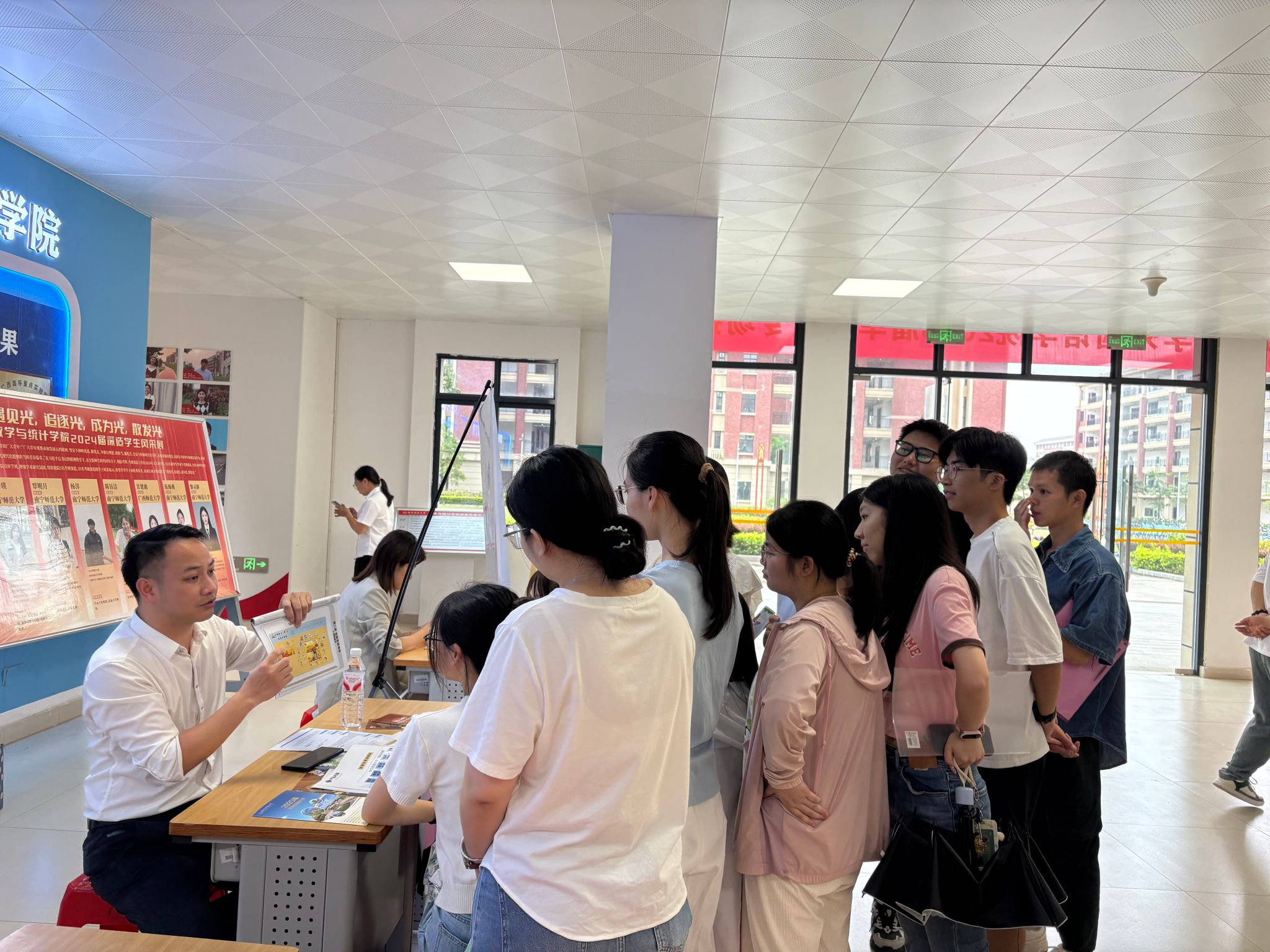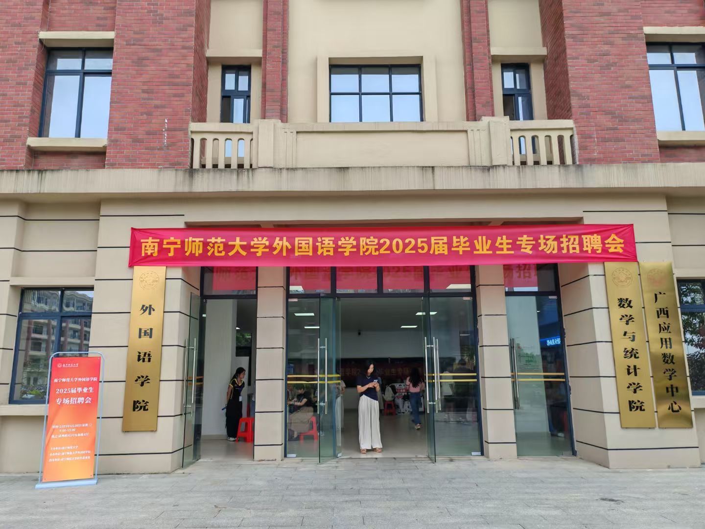 为扎实推进2025届毕业生就业工作,5月28日上午,学校外国语学院在武鸣校区1号实验楼大厅举办专场招聘会。学校招生就业处韦天翼副处长到场指导,外国语学院院长陈光伟、党委副书记刘晖晖和部分辅导员到场组织毕业班学生参加此次招聘会。
