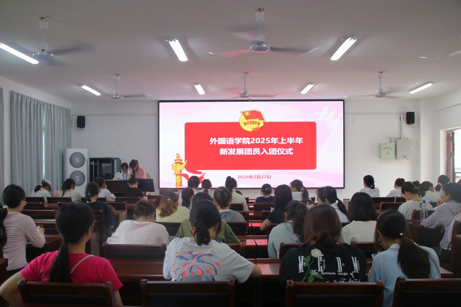 最后,全体起立奏唱团歌,入团仪式圆满结束。此次入团仪式为外国语学院共青团注入了新鲜血液。未来,新团员们将以入团誓词为指引,在学习和生活中展现共青团员的担当,为实现中国梦贡献青春力量。