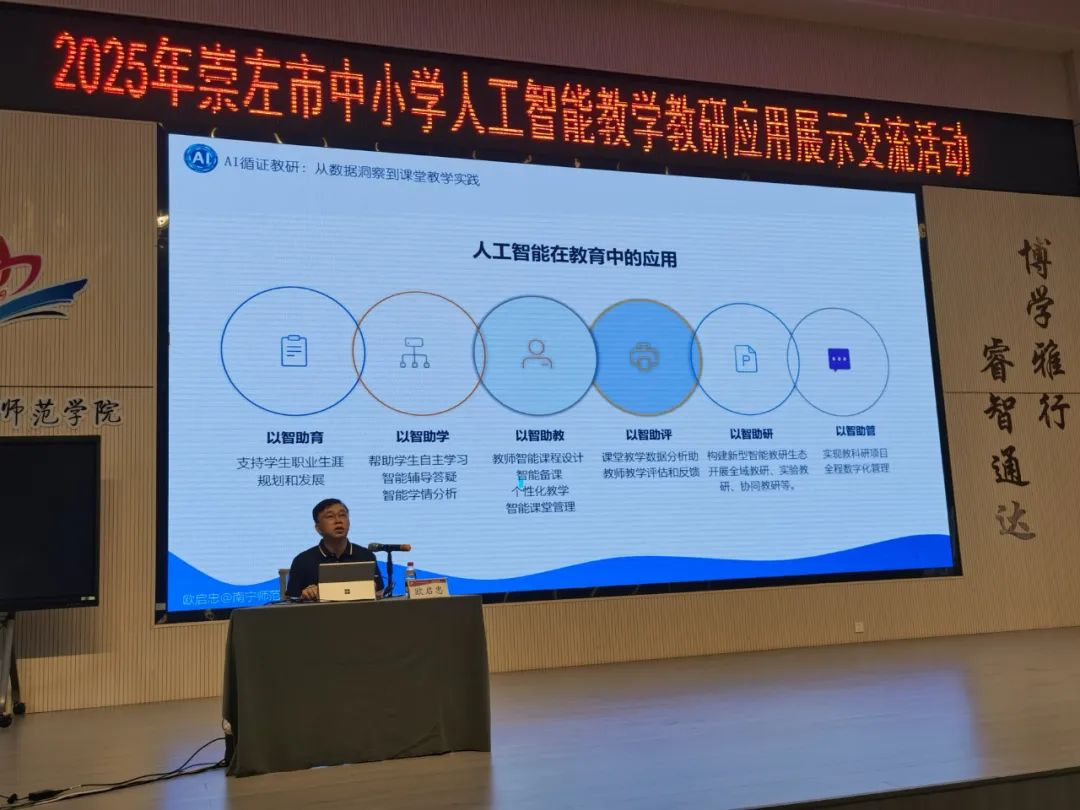 Beat365正版唯一官网必一人工智能学院副院长欧启忠教授以“人工智能循证教研”为主题,带来了一场精彩纷呈的专题讲座。欧启忠结合丰富案例,深入剖析人工智能在基础教育循证教研的深度应用,从理论框架到实践操作,为与会者提供了全面且实用的指导,充分展示了Beat365专家团队在推动人工智能赋能基础教育教研方面的专业引领能力。同时,广西民族师范学院附属第三小学校长陈留也进行了专题分享,附三小语文组教师则现场展示了人工智能在语文教研中的应用成果,生动呈现了新技术为教学带来的创新与变革。