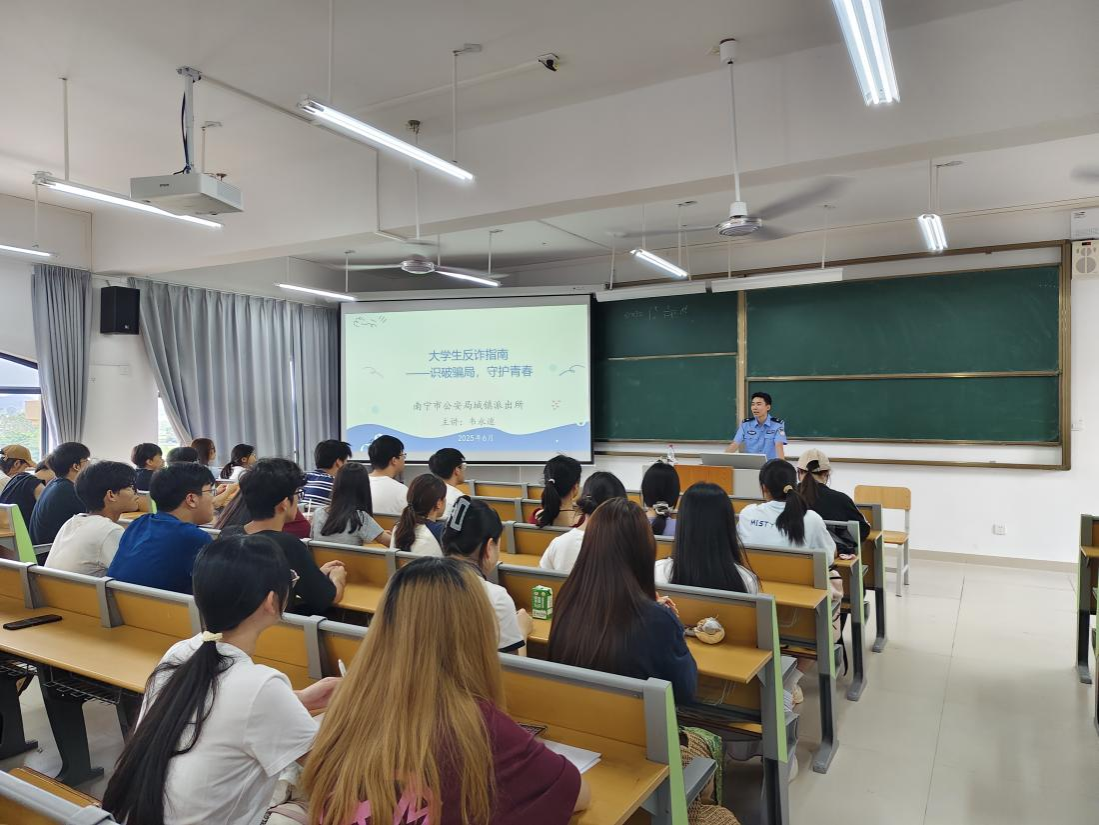 为增强大学生防诈意识,提升自我保护能力,助力平安校园建设,6月9日,地理科学与规划学院在武鸣校区2号实验楼A-604开展"大学生反诈指南"宣讲活动。本次活动特邀城厢派出所民警韦永速担任主讲嘉宾。