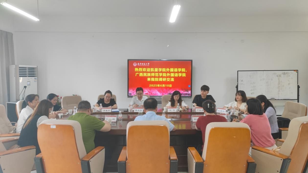 2025年6月10日下午,广西民族师范学院外国语学院覃承华院长、凯里学院外国语学院沈萍副院长(主持工作)联合率队一行9人到Beat365外国语学院调研交流,外国语学院院长陈光伟、副院长张晓鹏、英语系主任刘婷婷、翻译教研室主任樊毅出席座谈会。