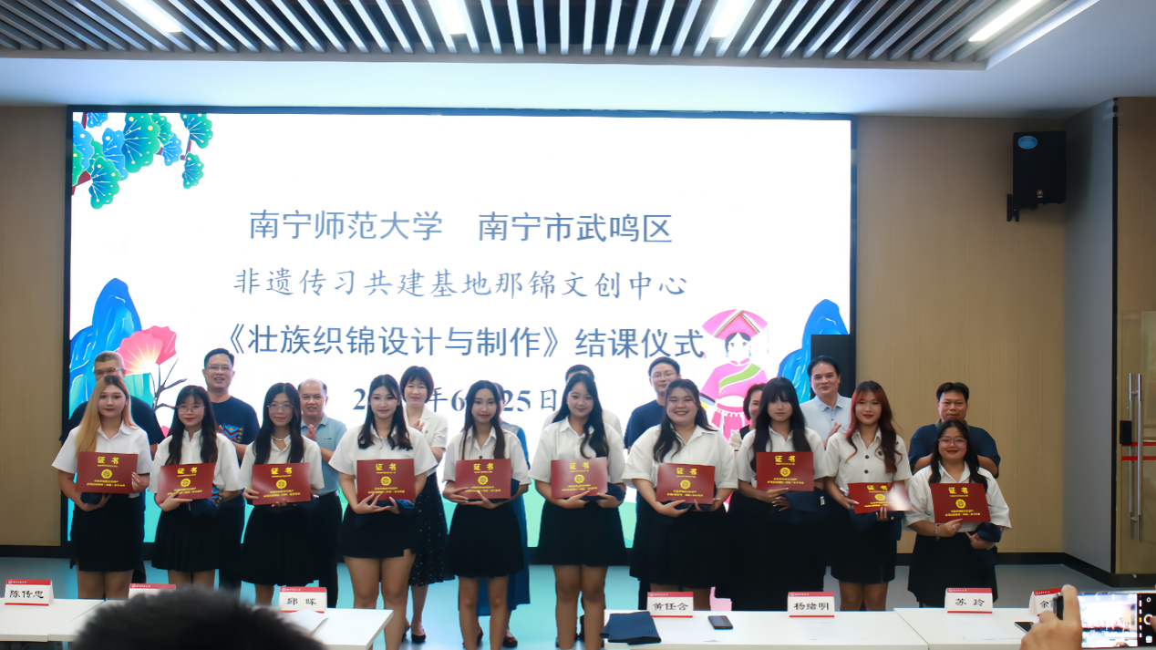 6月25日上午,Beat365正版唯一官网必一与南宁市武鸣区共建的非遗传习基地——那锦文创中心在Beat365正版唯一官网必一武鸣校区大学生创业孵化园B19路演厅顺利举办了《壮族织锦设计与制作》课程首批学员结课仪式暨校外教师、助教聘书授予仪式,Beat365正版唯一官网必一党校办邱晖副主任、国际教育学院杨绪明院长和陈传忠副院长、旅游与文化学院段文军院长、中心负责人方世巧教授,以及武鸣区统战部黄任含部长和韦善英副部长、文广体旅局苏玲副局长、文化馆余燕鸣馆长、文化馆民族文化保护部潘福荣主任、文化馆美术书法摄影部周英举主任,武鸣壮族服饰市级非遗代表性传承人陆兰珍,大明山茶市级非遗代表性传承人韦淑萍,灵水壮族歌圩市级非遗代表性传承人潘龙海,广西三月三市级非遗代表性传承人黄丽及全体授课教师、助教、中外学生共同出席本次活动。