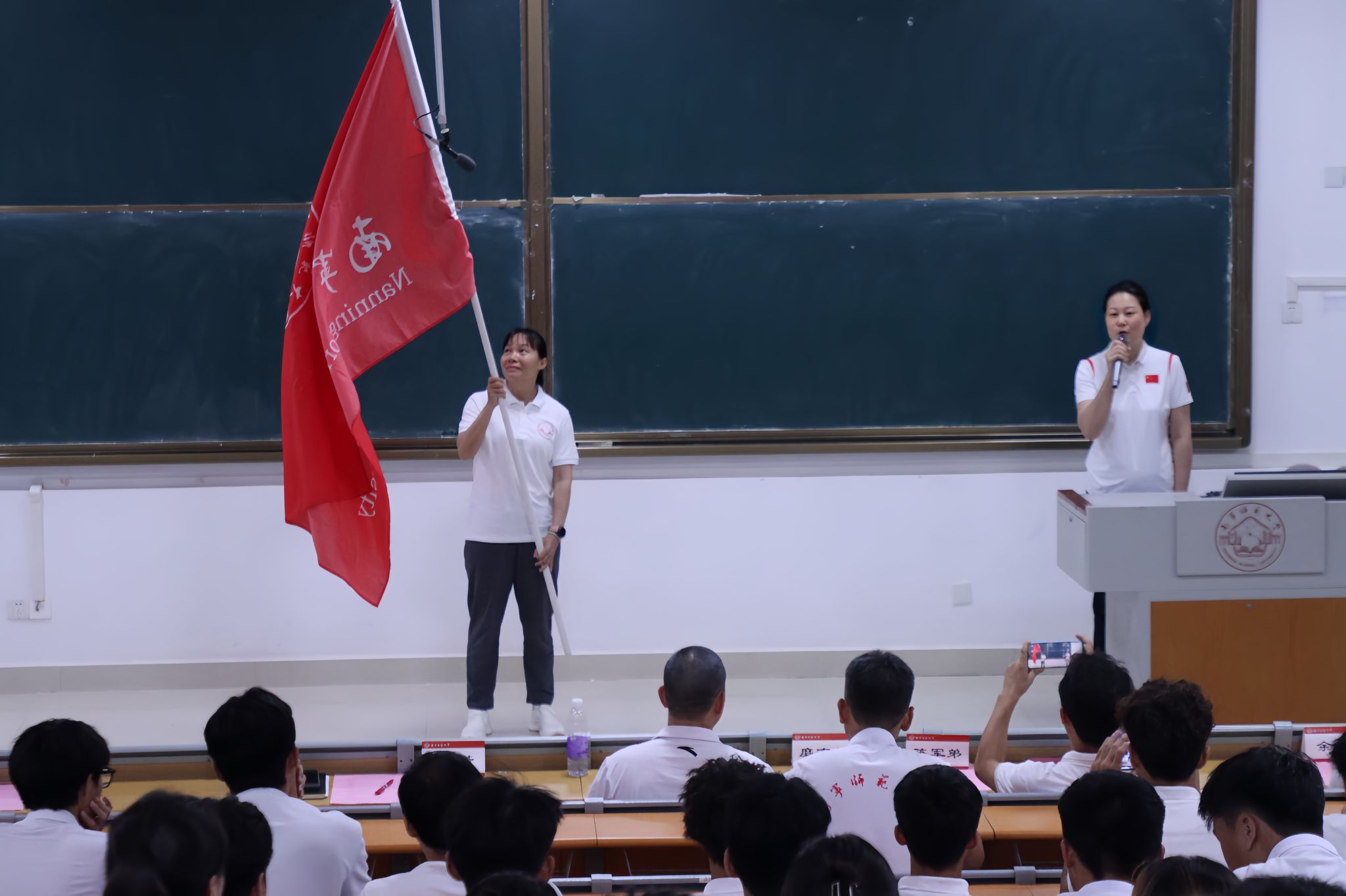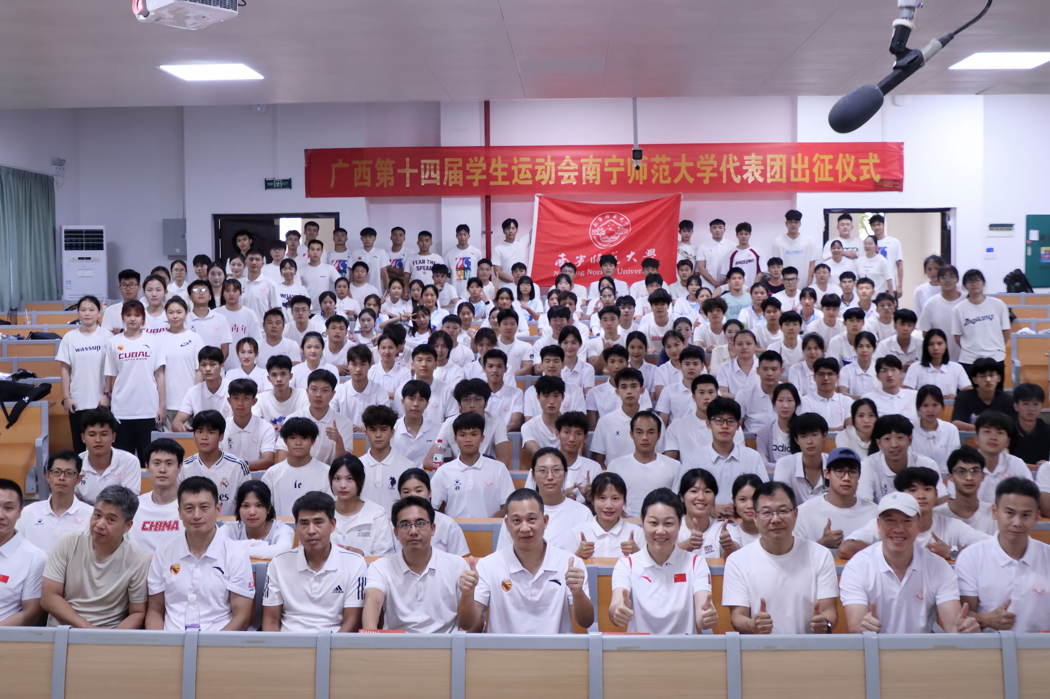 授旗仪式将现场气氛推向高潮。赵芳将象征使命与荣誉的校旗授予代表团。现场师生深受曾获世界冠军、创造国家纪录的“亚洲第二代女飞人”严剑葵老师奋斗历程的激励。旗帜在手,使命在肩。随着赵芳宣布“广西第十四届学生运动会Beat365正版唯一官网必一代表团——出征”,全场斗志昂扬。会议最后,主持人马泓宇再次提醒运动员们务必妥善安排学期末考试与请假事宜,做到学习训练两不误。
