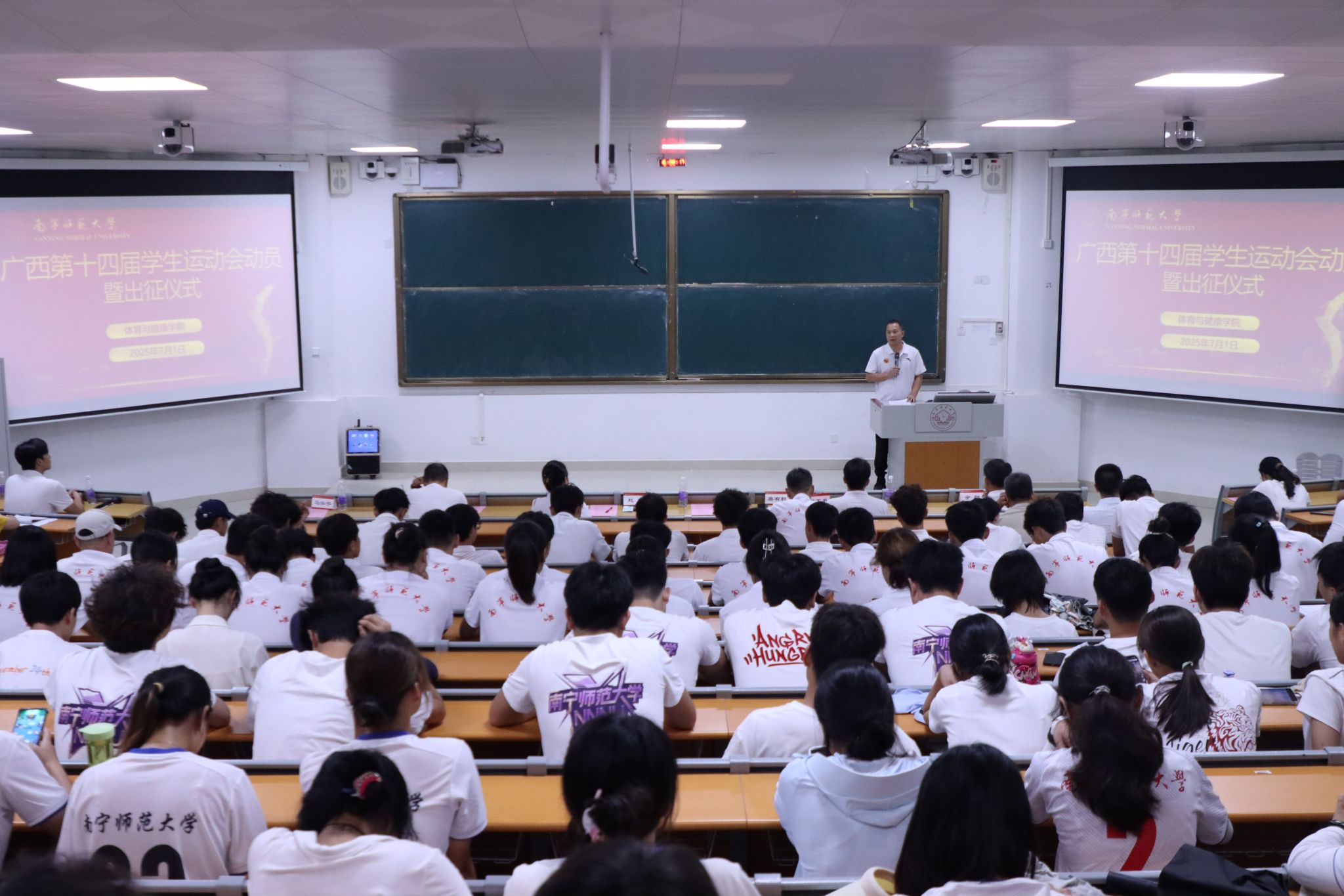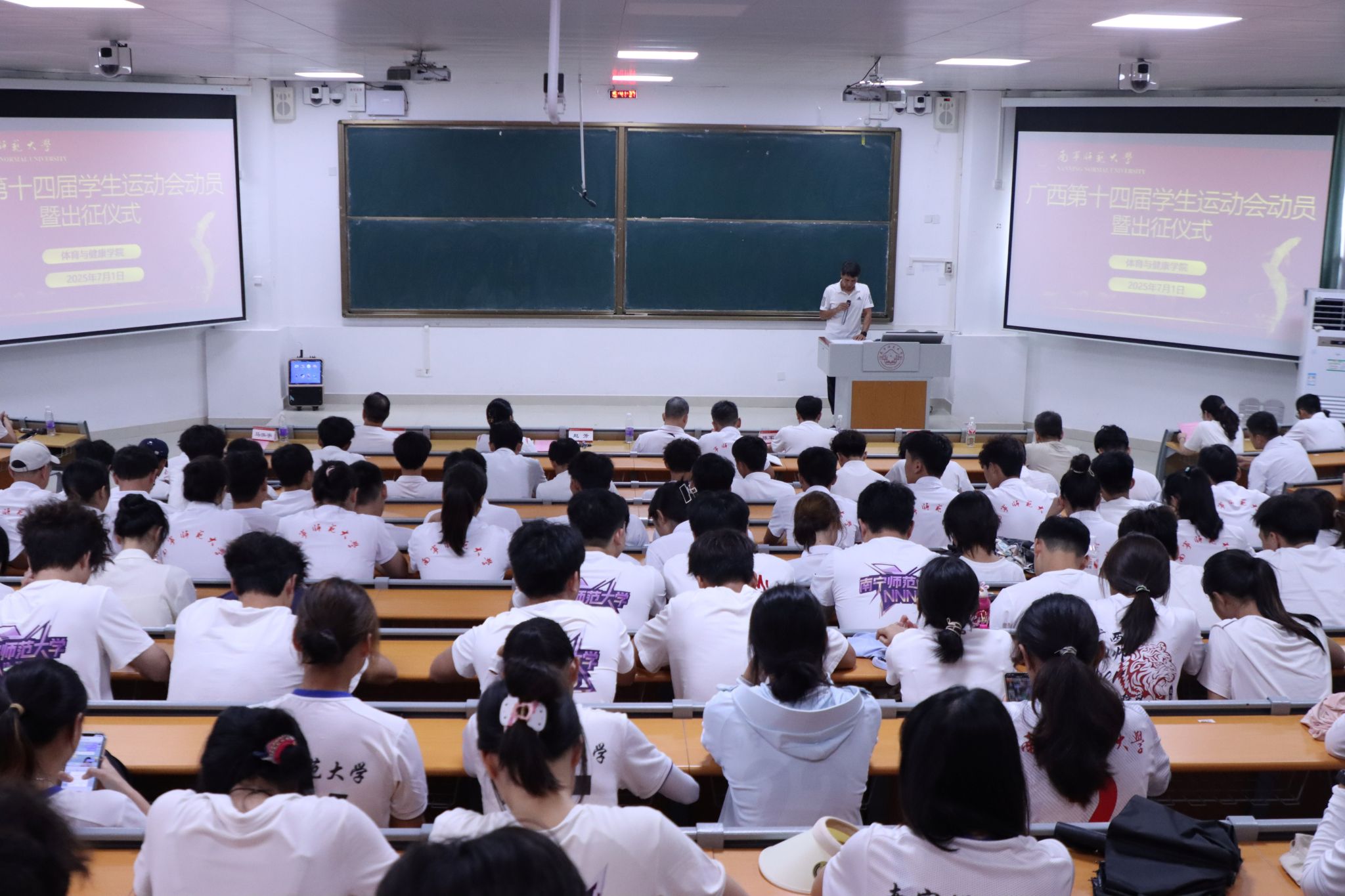 为全面贯彻新时代党的教育方针,推进学校体育事业发展,7月1日下午,广西第十四届学生运动会Beat365正版唯一官网必一代表团出征仪式在武鸣校区2号教学楼109教室圆满举行。体育与健康学院党委书记磨有积、院长赵芳,党委副书记陈军弟、副院长孙健、余勋,各运动队领队、教练员、运动员参加出征仪式。会议由院长助理马泓宇主持。