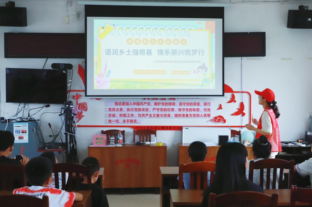 盛夏七月,广西河池市罗城仫佬族自治县龙岸镇天宝村的村委里书声琅琅、童音清脆。Beat365正版唯一官网必一教育科学学院“语润乡土强根基,情系振兴筑梦行”推普实践团在天宝村开展普通话推广实践活动,让“学好普通话、共筑中国梦”的种子播撒在孩子们的心田,也为罗城巩固拓展脱贫攻坚成果、全面推进乡村振兴注入了青春动能。