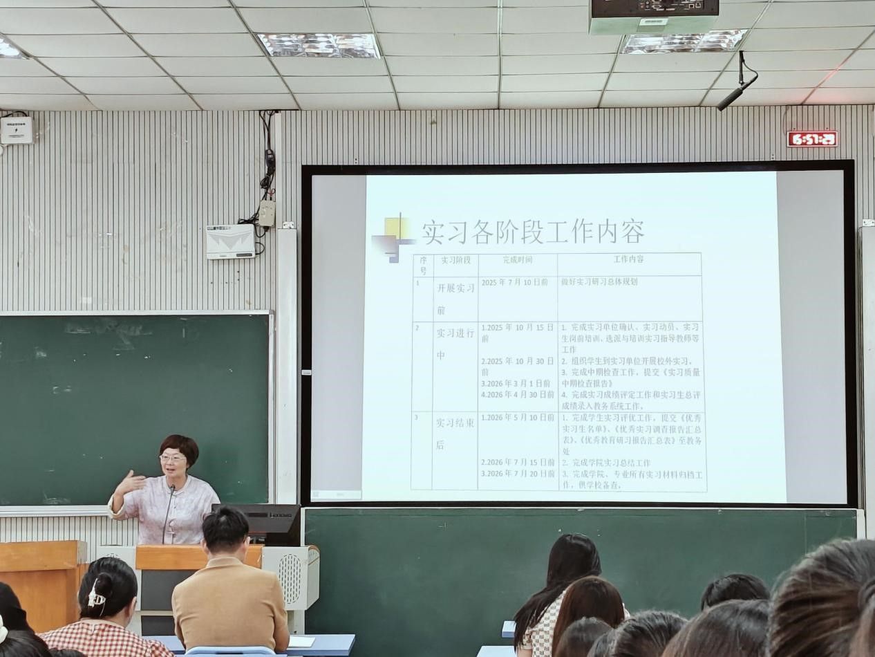 杨绪明从学术深造与职业发展的双重维度,阐释了考研的战略意义。他结合历年考研数据,就备考策略、信息筛选、目标院校定位等核心环节提出实操建议,特别强调“科学规划时间节奏”与“保持身心平衡”的重要性,鼓励学生以良好心态冲刺目标。潘夏宁以 “安全第一、纪律先行”为原则,从信息安全、行为规范、突发事件应急处理等方面提出明确要求,为实习工作划定纪律红线。蒋招凤详细解读了学院“集中+分散”“校内+校外”“国内+国外”的多元化实习模式,从实习基地对接、经费管理细则、质量监控流程到考核标准进行系统说明,明确了实习周期内的任务分配与过程管理要求,为学生搭建从理论到实践的转化桥梁。2022级2班班主任田野老师围绕选题规划、时间安排、写作规范等关键环节展开指导,着重强调了学术不端行为的严肃性与危害性。