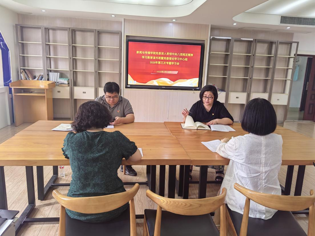 7月10日上午,新闻与传播学院党委在明秀校区文星楼506室召开深入贯彻中央八项规定精神学习教育读书班暨党委理论学习中心组2025年第三次专题集中学习会。学院党委理论学习中心组成员参加会议。