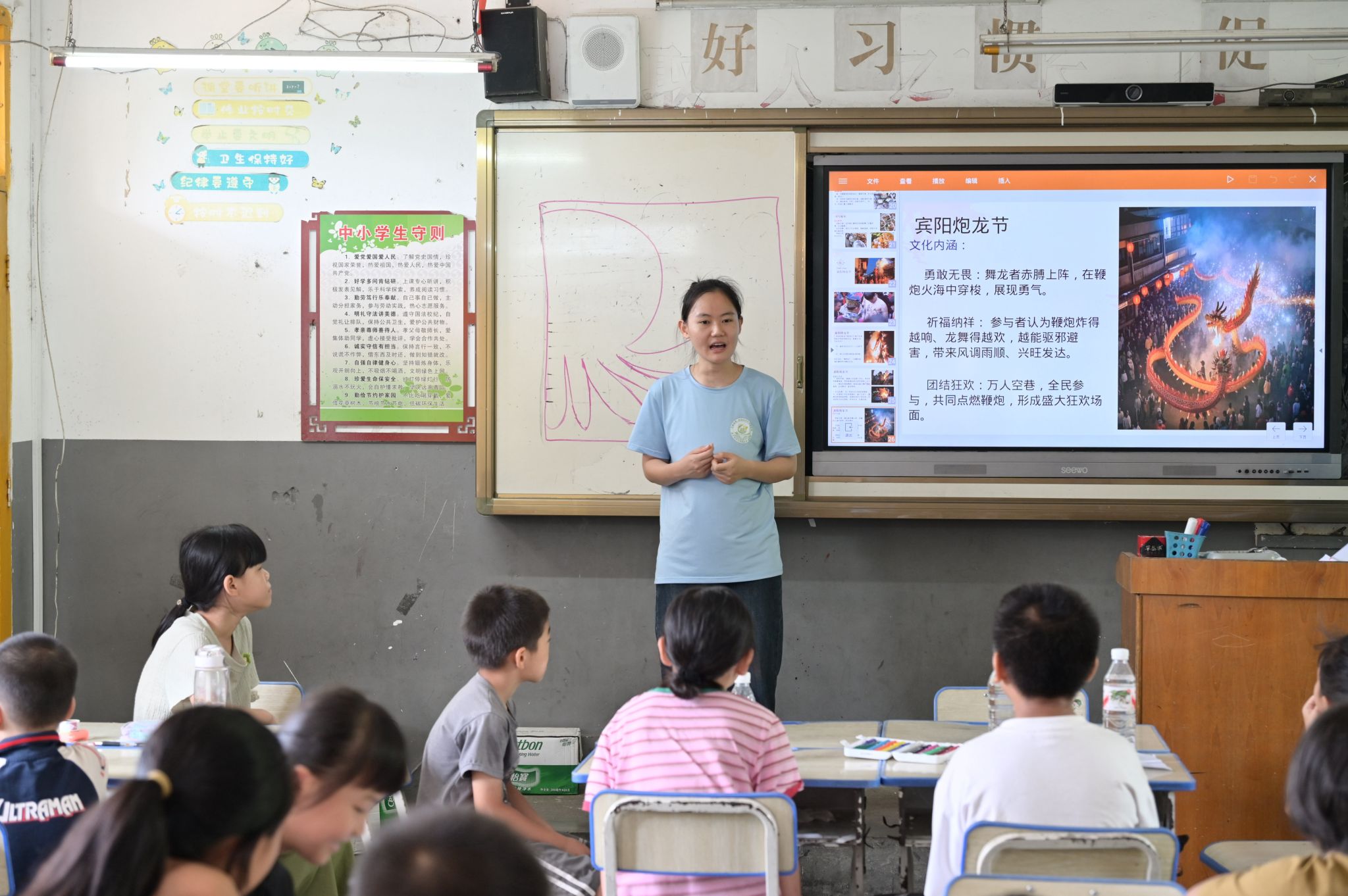 作为宾阳文化瑰宝,炮龙节引发了孩子们的热烈共鸣。课堂上,师生互动问答,展现着本土文化的深厚底蕴与鲜活传承;多媒体视频中的鞭炮声响起,百年炮龙迎难而上、坚韧勇敢的精神内核得以重温。