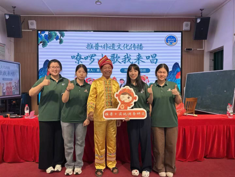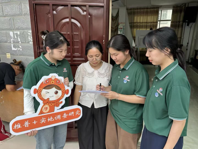 调研组还访谈了当地非遗项目嘹啰山歌传承人苏兰育老师。作为壮族山歌文化的传承人,苏兰育老师对推普工作给予积极评价。他表示:“学好普通话能帮助更多人深入理解嘹啰山歌蕴含的民族历史与生活智慧。”他认为,“非遗+推普”的融合模式既能让普通话在民族地区扎根,又能让传统非遗文化借助通用语言获得更广泛传播,为乡村文化振兴注入新活力。