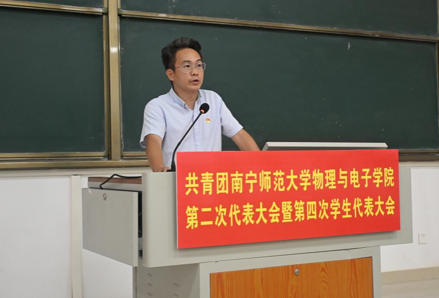 何俊斌代表校团委致辞,他高度肯定了物理与电子学院团学工作的创新实践与成果,并期望新一届团学干部要筑牢思想根基、勇于改革创新、持续加强组织建设,团结引领广大青年为学校发展贡献青春智慧与力量。